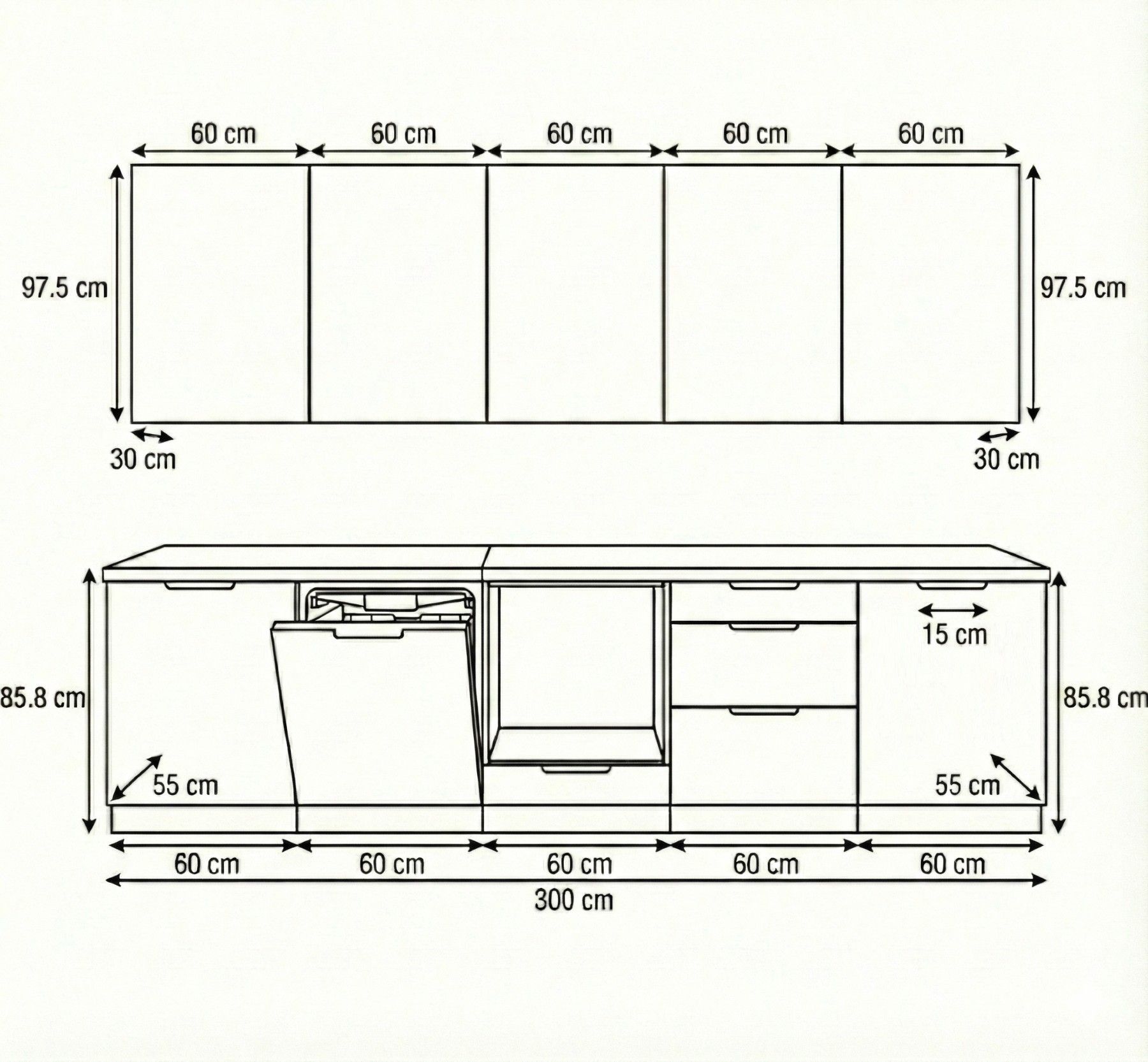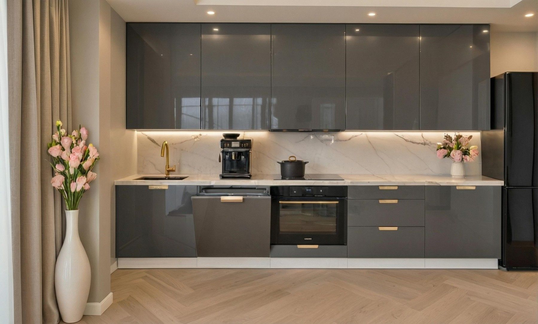 Küchenzeile Linea 300 cm DW Grau Hochglanz-Soft Close- Premium Box- Einbauküche 3m