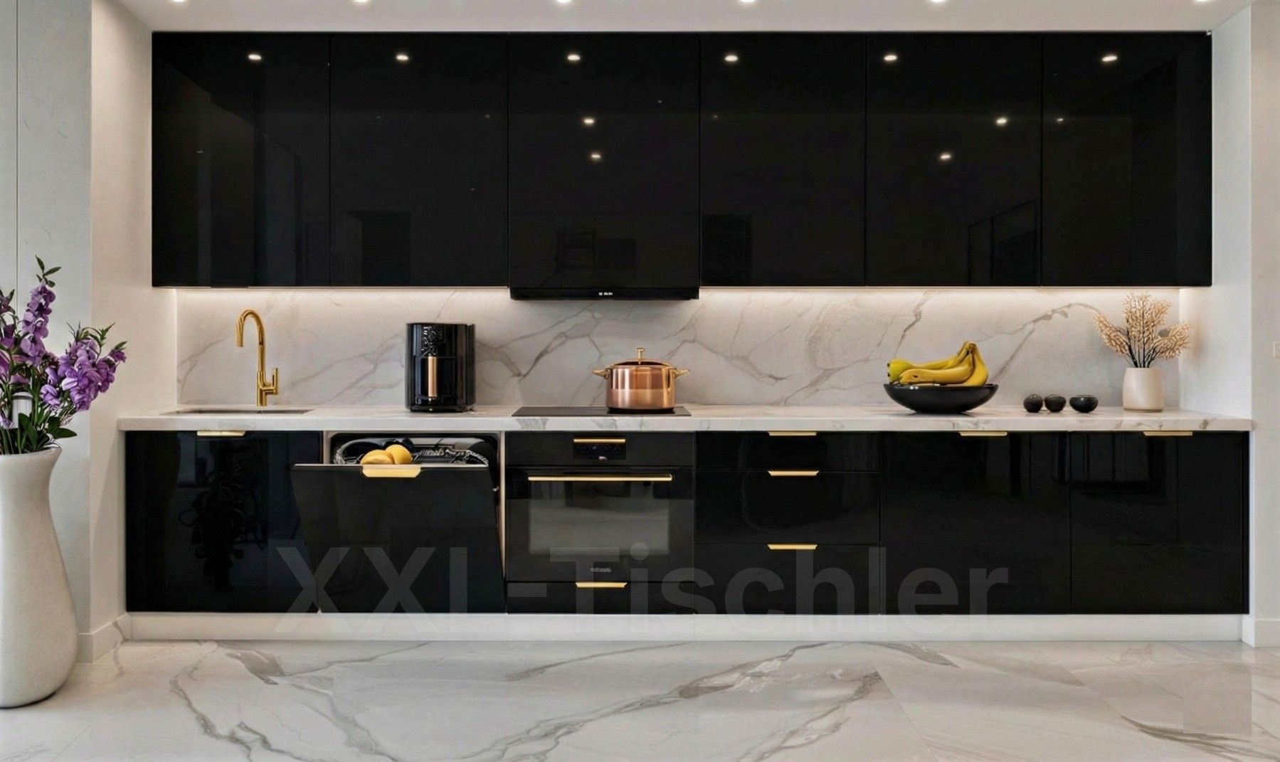Küchenzeile Linea 360 cm DW Schwarz Hochglanz-Soft Close-Premium Box-Einbauküche 3,6m