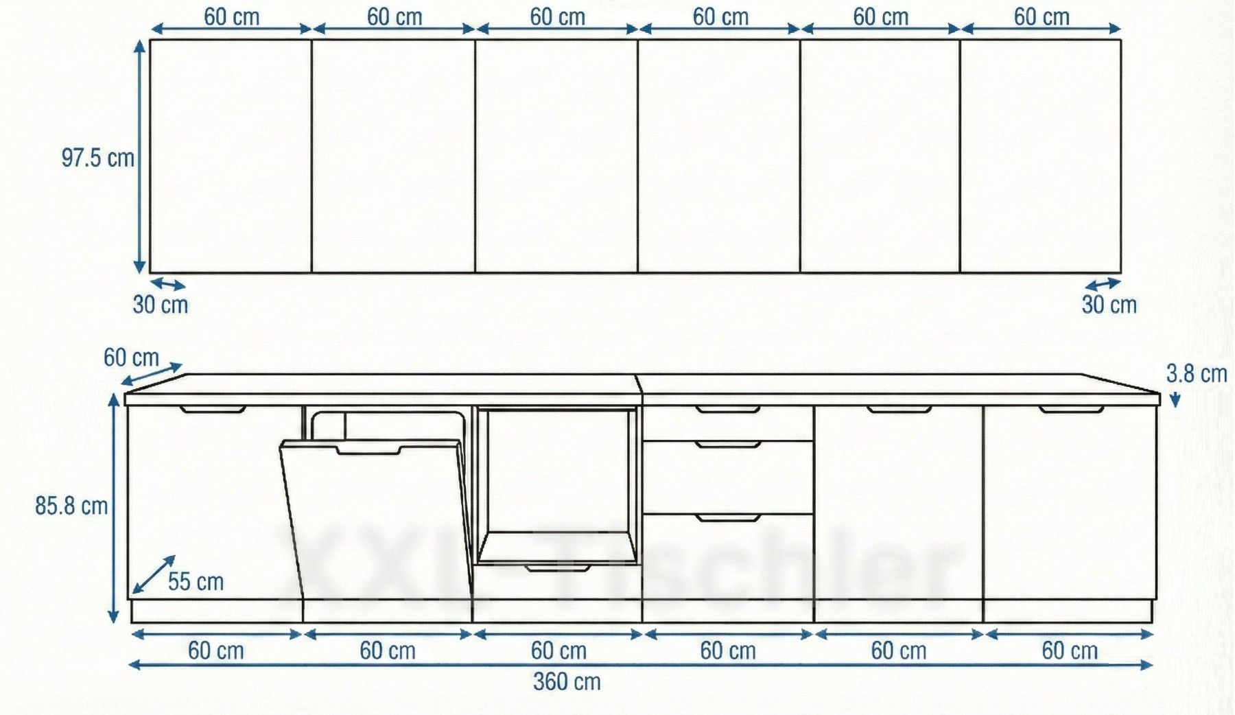 Küchenzeile LINEA 360cm DW Weiß Hochglanz Matt Ware direkt vom Hersteller, ohne Zwischenhändler Direkt vom Hersteller Beschreibung Die Linea Küche vereint modernes Design mit höchster Funktionalität und durchdachtem Komfort für Ihr Zuhause. Ausgestattet mit dem Premium Box Schubladensystem in Kombin