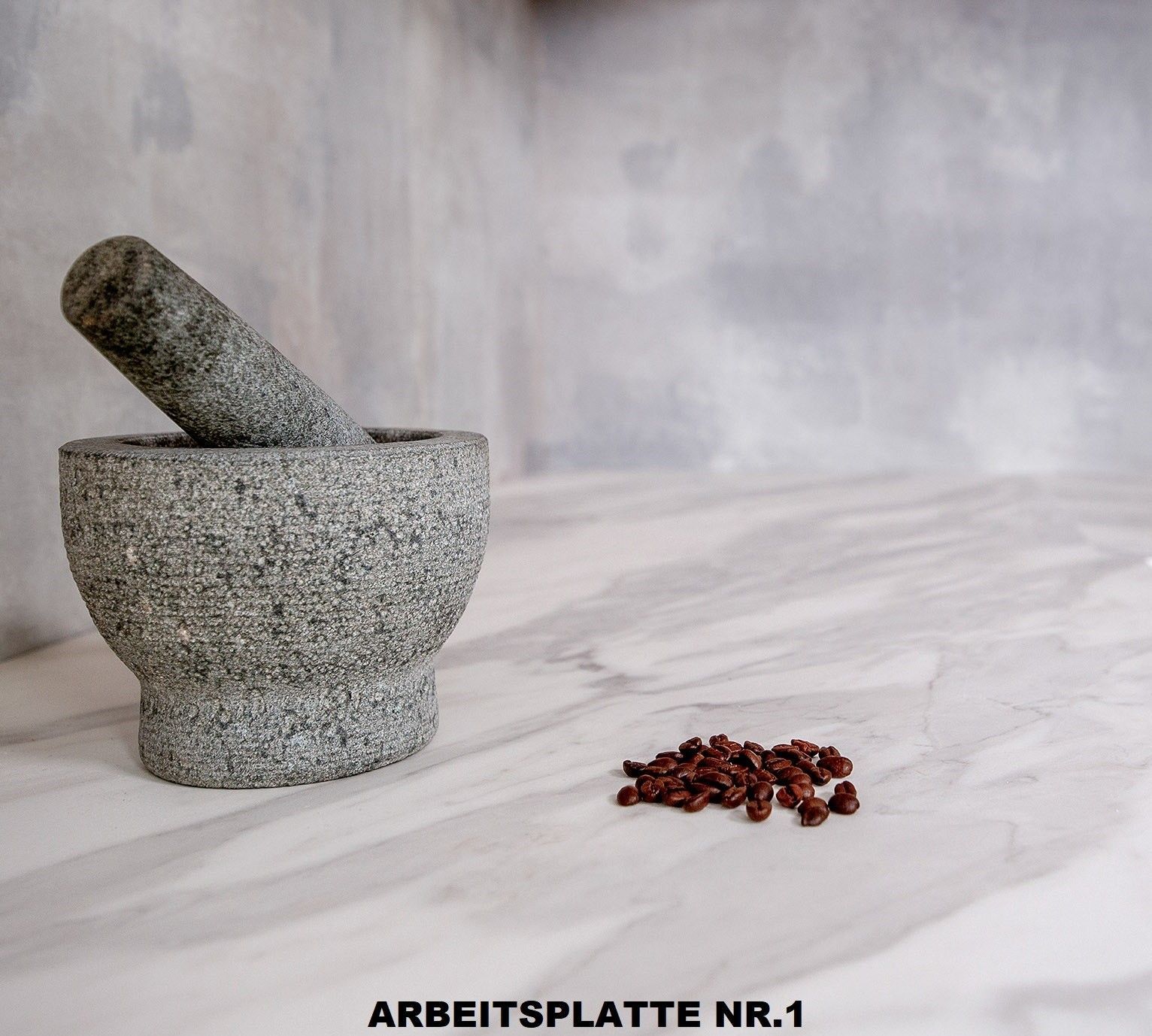 Nr.1 (in heller Marmorfarbe), Nr.2 (in Betonfarbe), Nr.3 (Goldkraft Eiche) und Nr.4 (Crema Limestone)