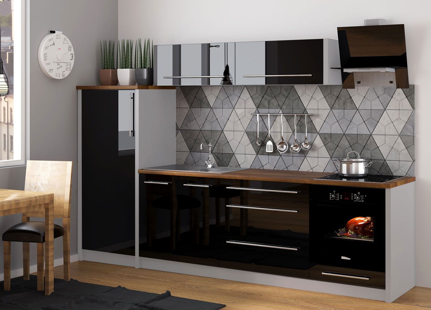 Küchenzeile Platinum Mansardenküche 280cm Teilauszug grau Fronten schwarz Hochglanz