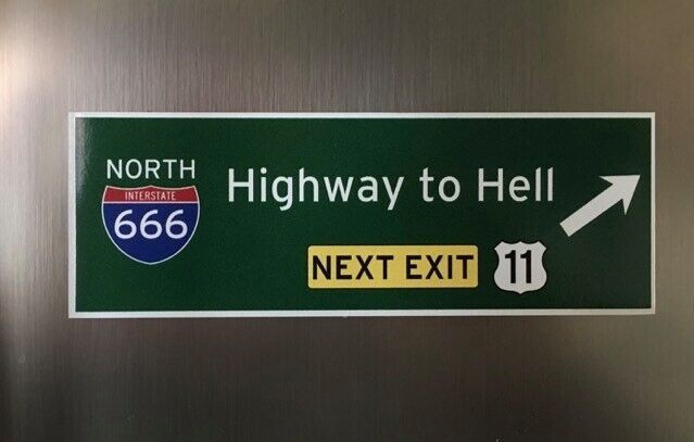 cooles XL Magnetschild für den Kühlschrank ! Interstate Highway to Hell - next Exit ! In Form eines US Interstate Strassenschildes ! Größe des Magnetschildes ca. 14,4 x 5 cm Achtung: Nicht geeignet für Kinder unter 3 Jahren