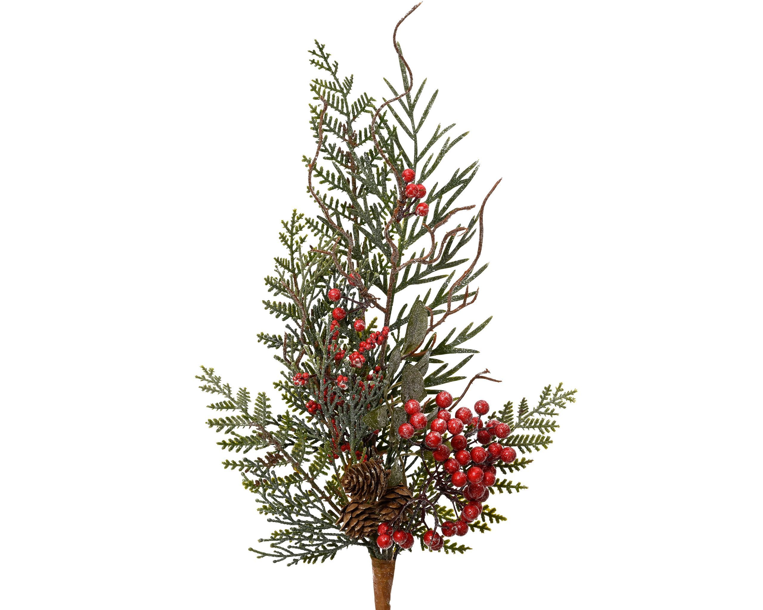 Künstlicher Zweig 50cm mit Zapfen und roten Beeren beschneit Grün Rot