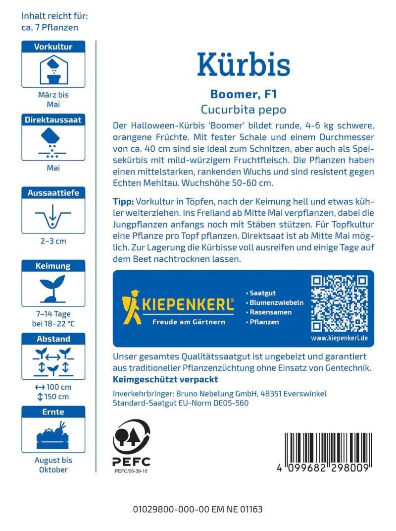 Kiepenkerl Kürbis Boomer, F1, Halloween-Kürbis - Ideal zum schnitzen - resistent
