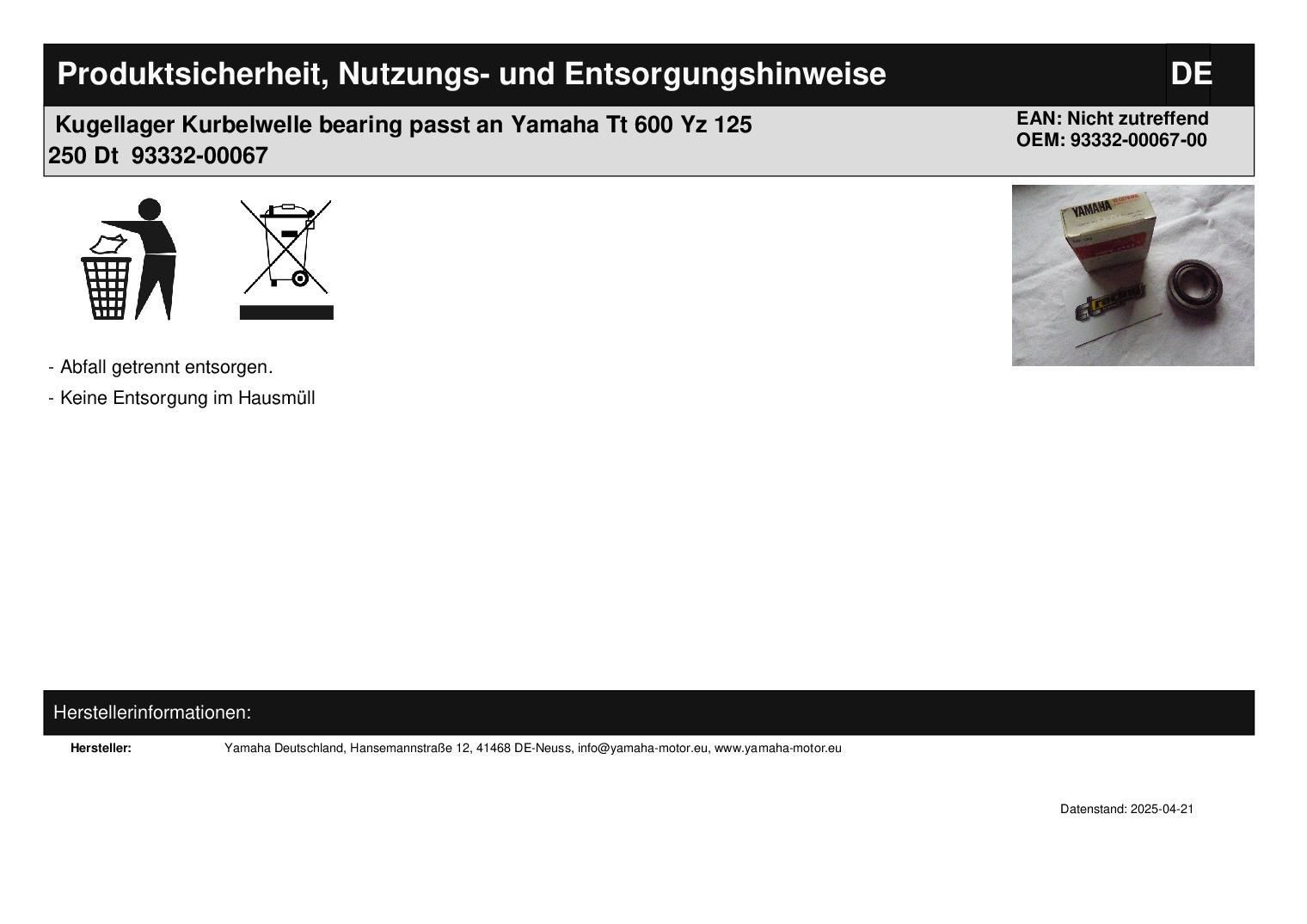 Kugellager Kurbelwelle bearing passt an Yamaha Tt 600 Yz 125 250 Dt 93332-00067
