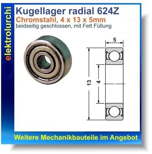 Sie bieten hier auf folgenden Artikel 2 Stück Kugellager radial 624Z, Chromstahl, 4x13x5mm beidseitig geschlossen Fett Kugellager beidseitig geschlossen mit 2 Stahlscheiben Innendurchmesser: 4mm Außendurchmesser: 13mm Höhe: 5mm