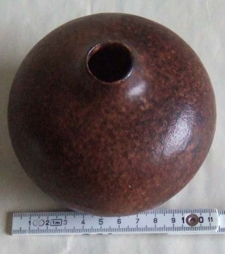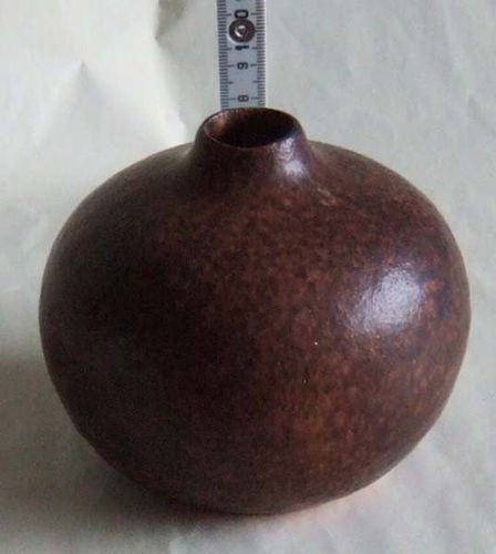 Kugelvase aus Keramik mit kleiner Öffnung auch als Kerzenständer geeignet Hauptfarbe: braun Maße: ca. 8,5 x 11 cm (HxD), Mündungsdurchmesser 2,1 cm Fassungsvermögen: 500 ccm Vintage (aus 1980er Jahre) neu , unbenutzt, sehr guter Zustand, keine Kratzer oder dergleichen