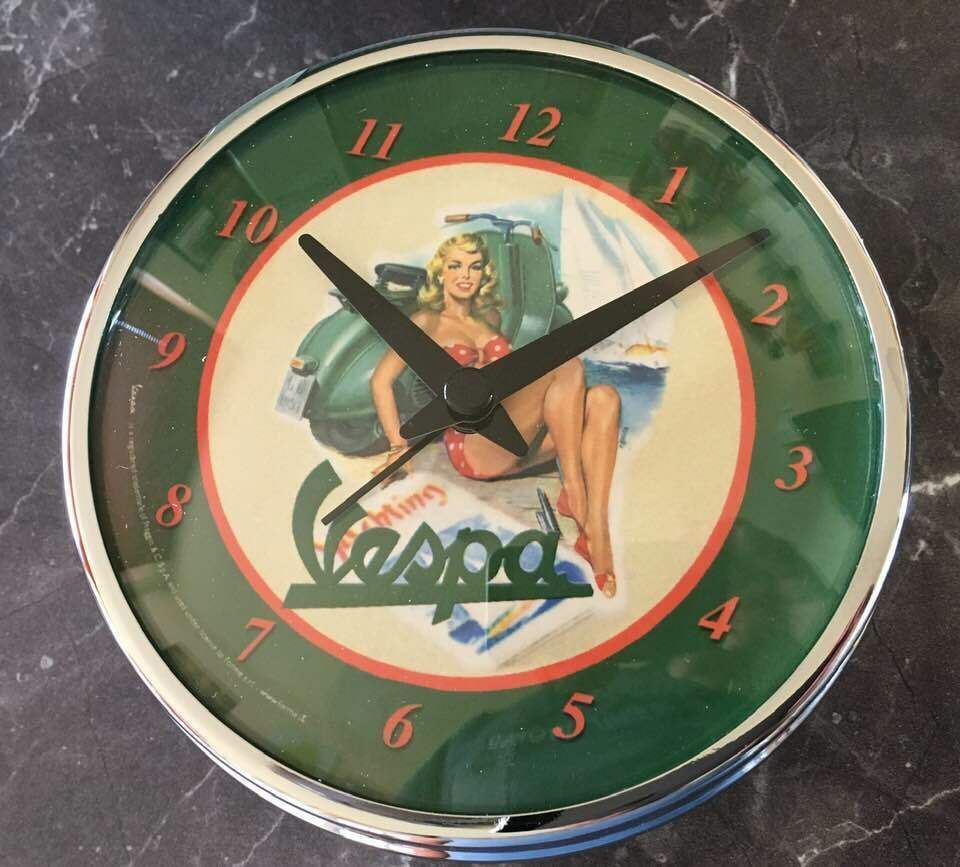 Kultiger Vespa Wecker: 1. Alla loro felicità manca solo la Vespa ( What is missing from their happiness... only a Vespa Was fehlt ihnen zum Glueck... nur eine VESPA 2. VESPA Yachting - Pinup Lady Durchmesser: ca. 12 cm Kann aufgestellt oder gehängt werden In Geschenkverpackung Neu + ovp - Lizenzware