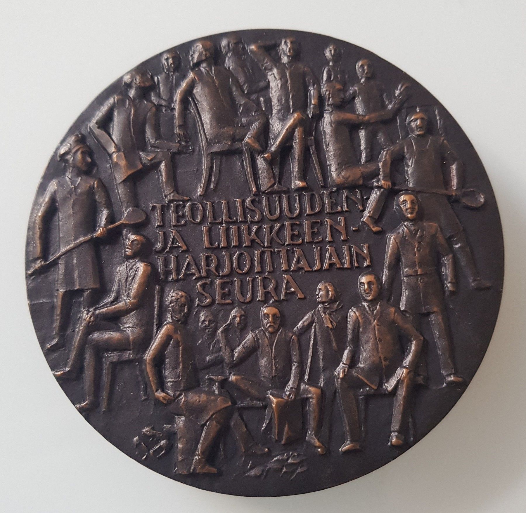 Sie erwerben eine Kunst Medaille von Kauko Räsänen auf den 100.ten Jahrestag der Pamaus Gesellschaft aus dem Jahr 1991. Auf der Vorderseite sehen wir die Inschrift in vier Zeilen: Teollisuuden - Ja Likkeen - Harjoittajain-Seura ( Gesellschaft der Industrie und Gewerbetreibenden ) erhaben und vertief