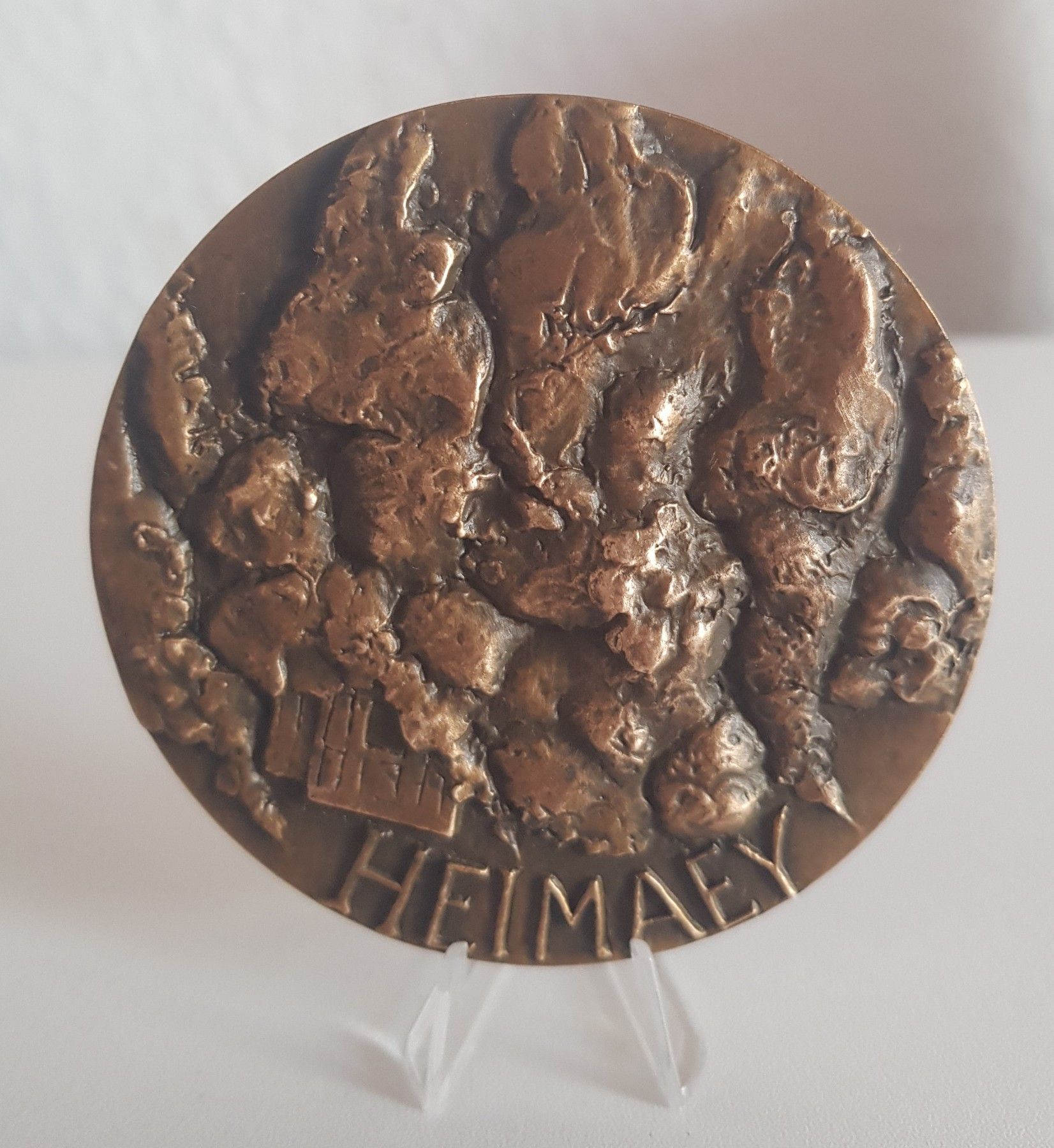 Sie erwerben eine Kunstmedaille von Eila Hiltunen mit dem Titel Islands Medaljen 1973 Auf der Vorderseite sehen Sie den Kopf eines Papageientauchers sowie die Inschrift: Island 1973 Die Rückseite zeigt uns die Inschrift: Heimaey sowie Aschewolken die an einem Haus vorbeiziehen symbolisch für die Vul