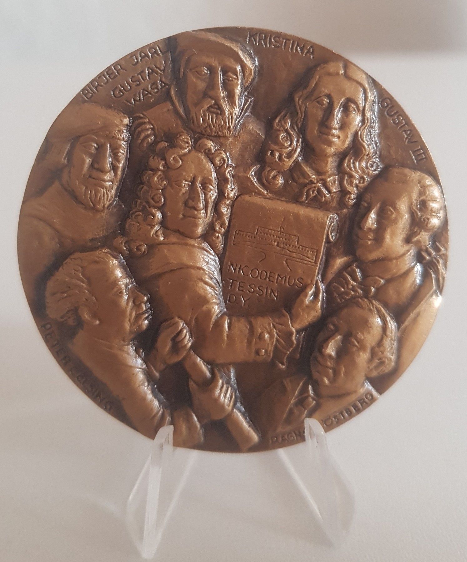 Sie erwerben eine Kunst Medaille von Elsie Dahlberg zum Thema Architektur von Stockholm und den Persönlichkeiten die, die Stadt städtebaulich geprägt haben. Auf der Vorderseite sehen Sie mittig Nicodemus Tessin umgeben von den Portraits von Birger Jarl Gustav Wasa- Kristina-Gustav II.Rangar Östberg-
