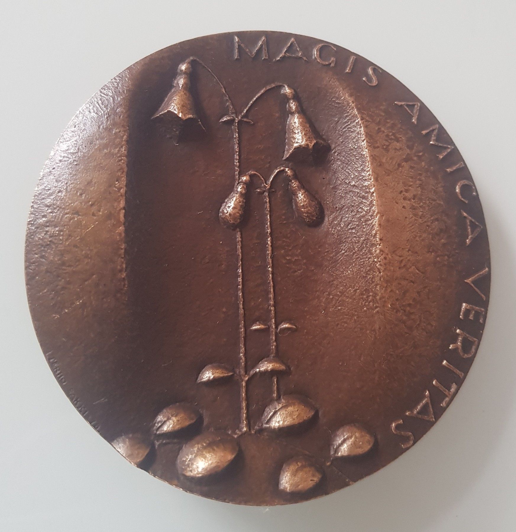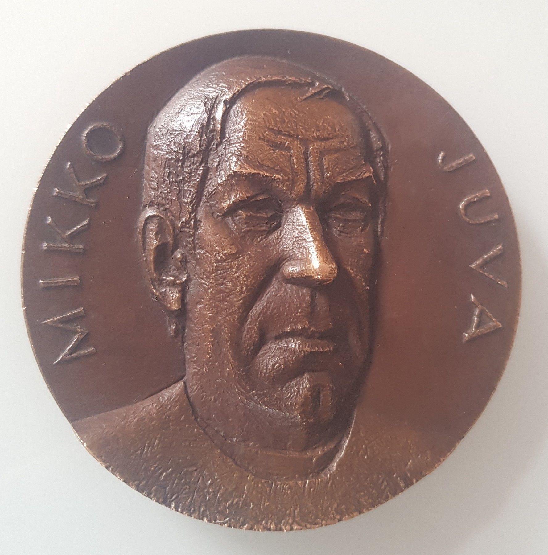 Sie erwerben eine Kunstmedaille von Terho Sakki zu Mikko Juva aus dem Jahr 1978 Theologe und Jurist. Auf der Vorderseite sehen wir das Portrait von Mikko Juva mit seinem Namenszug - erhaben und vertieft. Die Rückseite zeigt uns eine Glockenblume die Umschrift lautet: Magis Amica Veritas ( Mehr freun