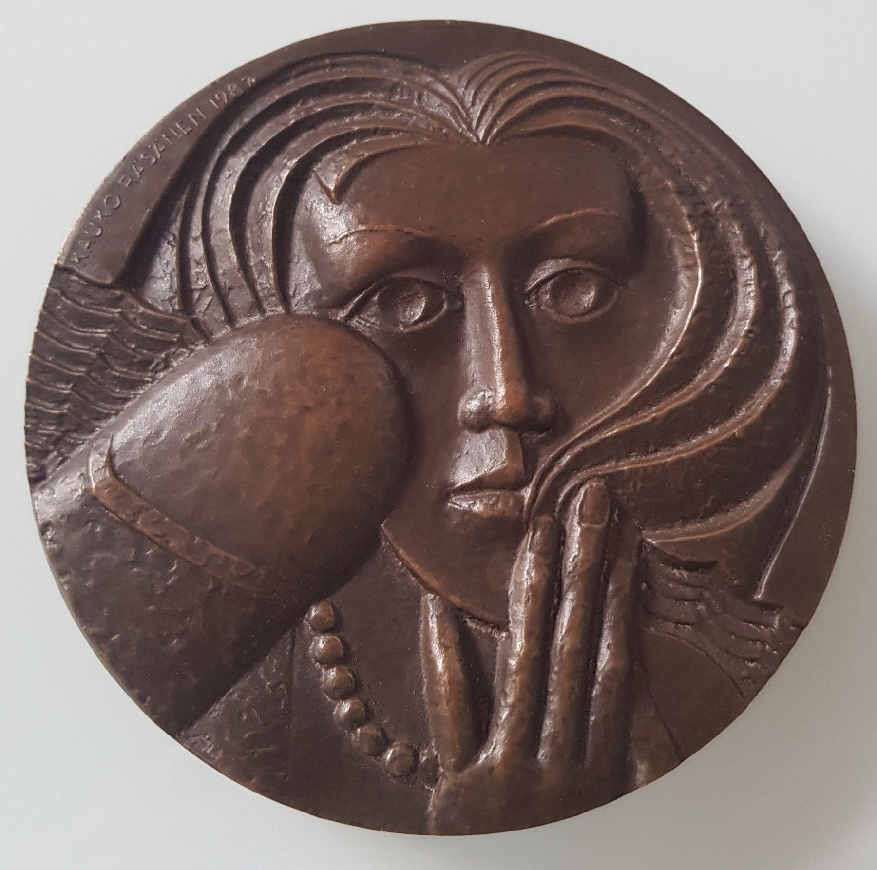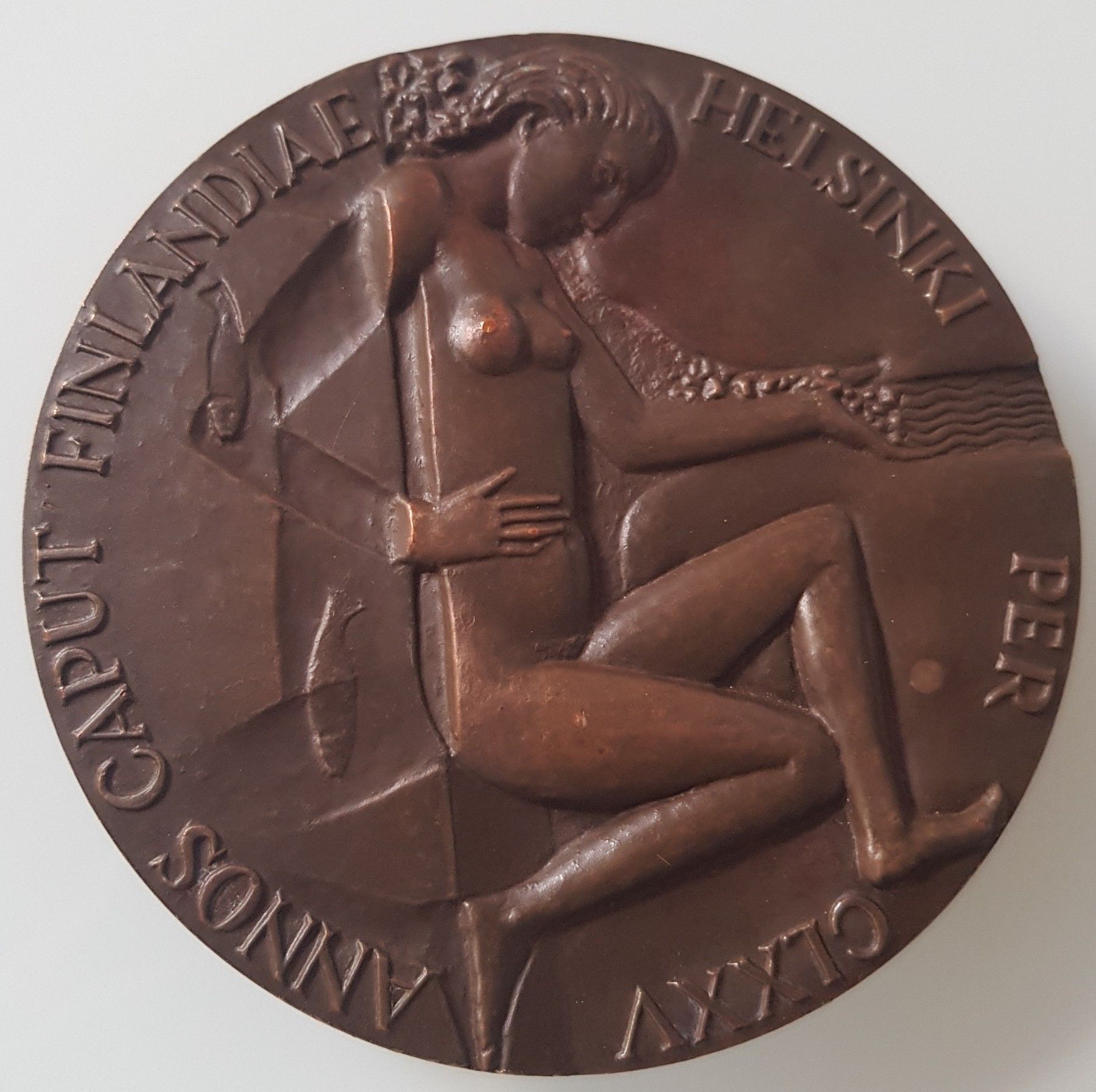 Sie erwerben eine Kunstmedaille Kauko Räsänen zum 175 Jahrestag der Erhebung Helsinkis zur Hauptstadt aus dem Jahr 1987. Auf der Vorderseite sehen wir einen weiblichen Akt auf dem rücken liegend mit der linken Hand berührt sie einen Wasserfall die rechte ist angewinkelt auf dem Bauch liegend der Arm