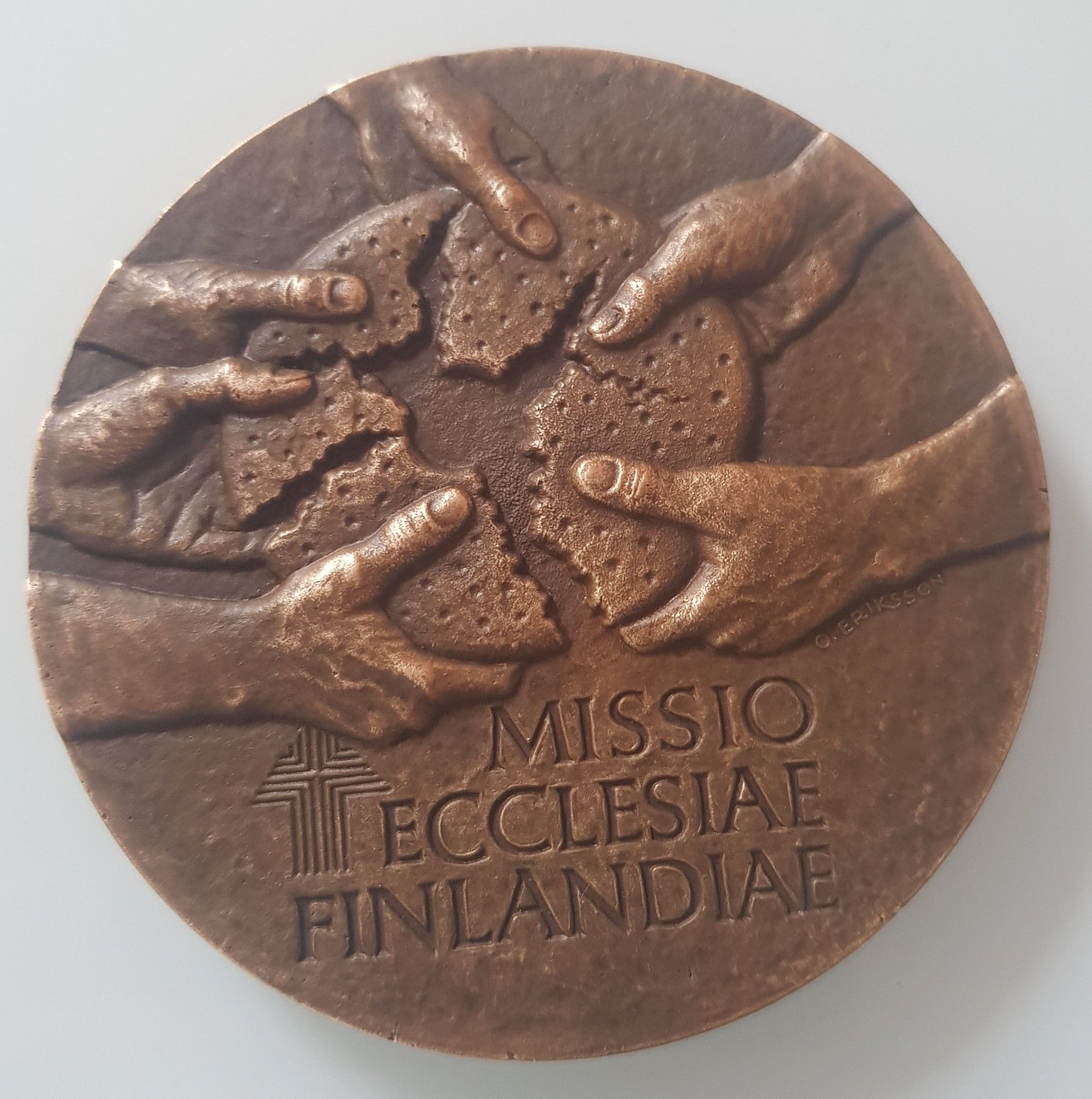 Sie erwerben eine Kunstmedaille von Olof Werner William Eriksson zu Missio Ecclesiae Finlandia aus dem Jahr 1969. Auf der Vorderseite sehen wir sechs Hände die das Brot brechen sowie die Inschrift: Missio Ecclesiae Finlandia ( Mission der Kirche Finnlands ). Die Rückseite lesen wir die Inschrift Luk