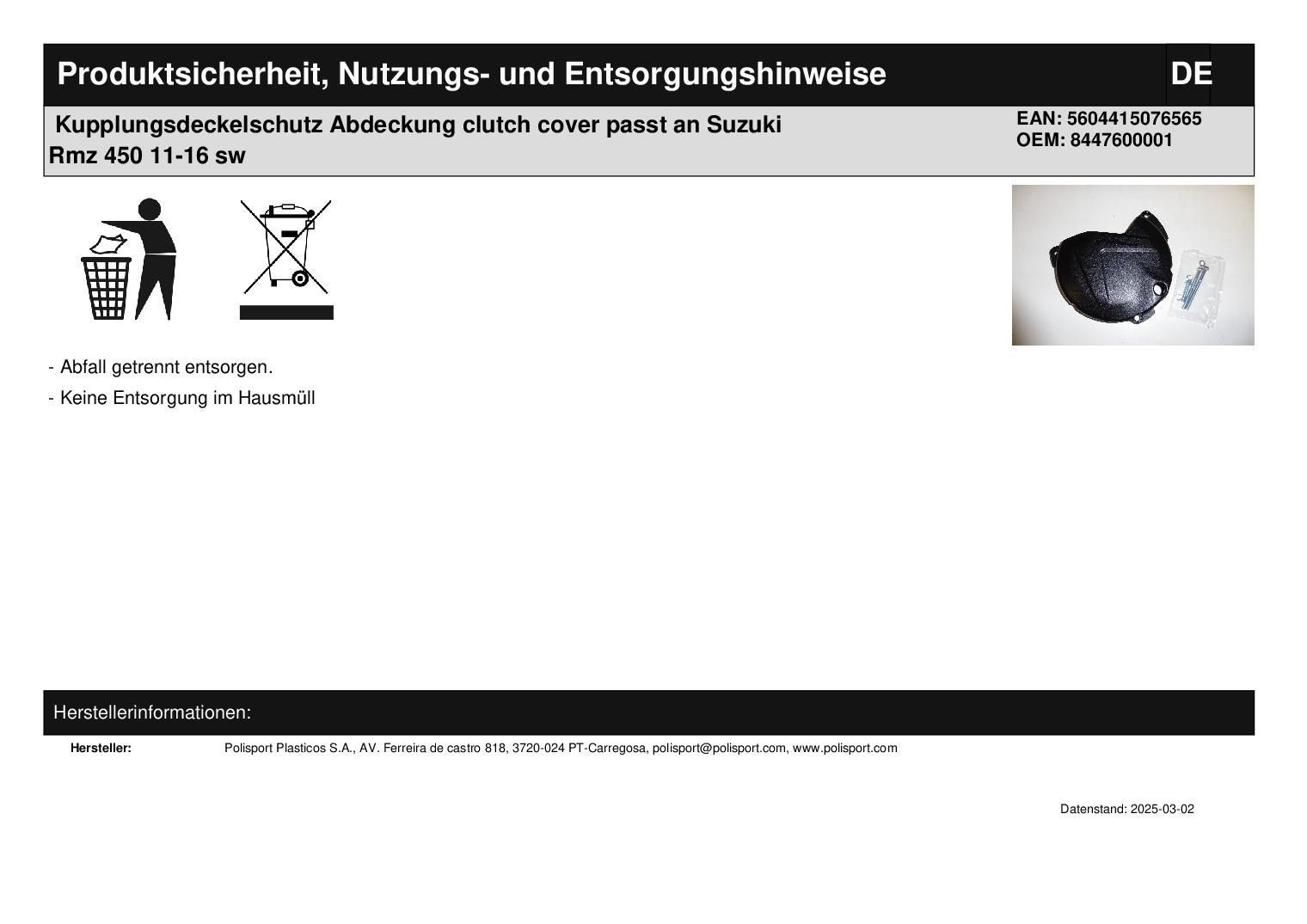 Polisport Kupplungsdeckelschutz Abdeckung clutch cover passt an Suzuki Rmz 450 11-16 sw