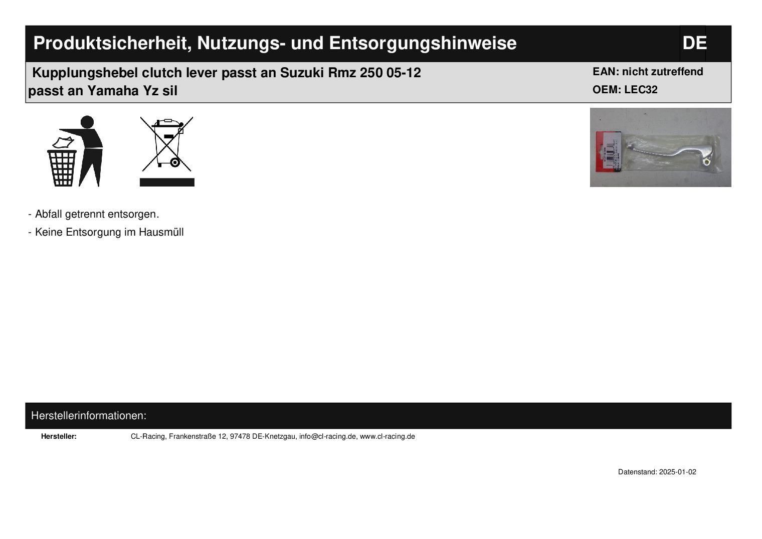 Kupplungshebel clutch lever passt an Suzuki Rmz 250 05-12 passt an Yamaha Yz sil In dieser Auktion gibt es folgenden Artikel zu kaufen: Kupplungshebel (siehe Foto) Modell: passend für Suzuki RMZ 250, 450 Bj.: 05 - 12 passend für Yamaha YZ 125, 250 Bj.: 00 - 12 YZF 250, 450 Bj.: 01 - 08 Lieferumfang: