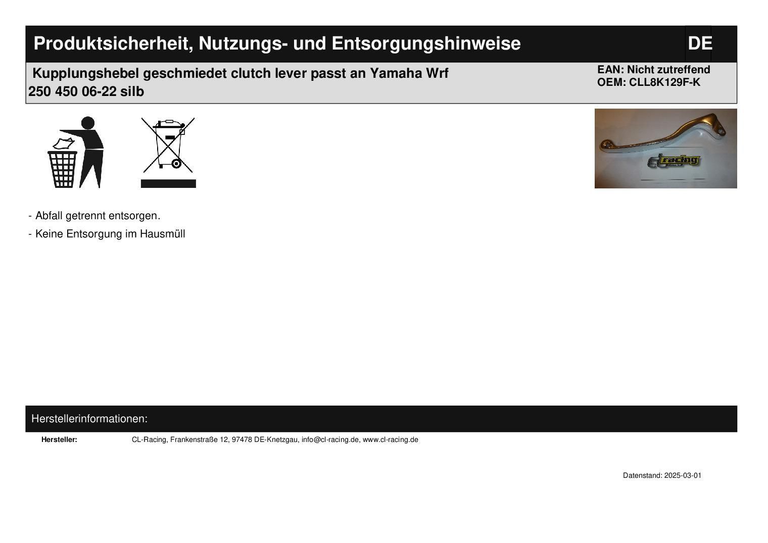Kupplungshebel geschmiedet clutch lever passt an Yamaha Wrf 250 450 06-22 silb In dieser Auktion gibt es folgenden Artikel zu kaufen: geschmiedeter Kupplungshebel (siehe Foto) Modelle: passend für Yamaha Wr-f 250 Bj.: 2006 - 2022 (4-Takt) Wr-f 450 Bj.: 2005 - 2022 (4-Takt) Artikelbeschreibung: Der H