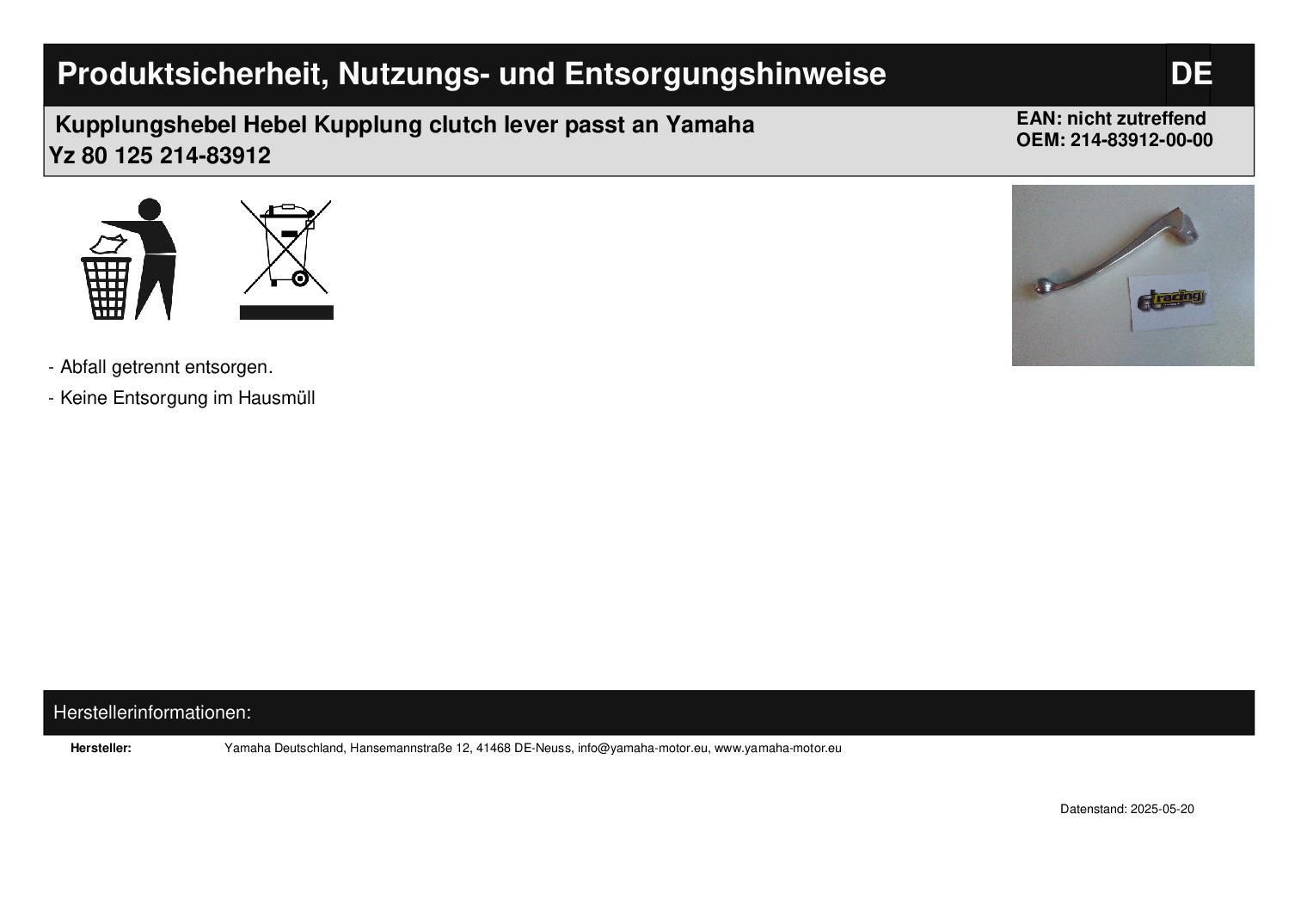 Kupplungshebel Hebel Kupplung clutch lever passt an Yamaha Yz 80 125 214-83912