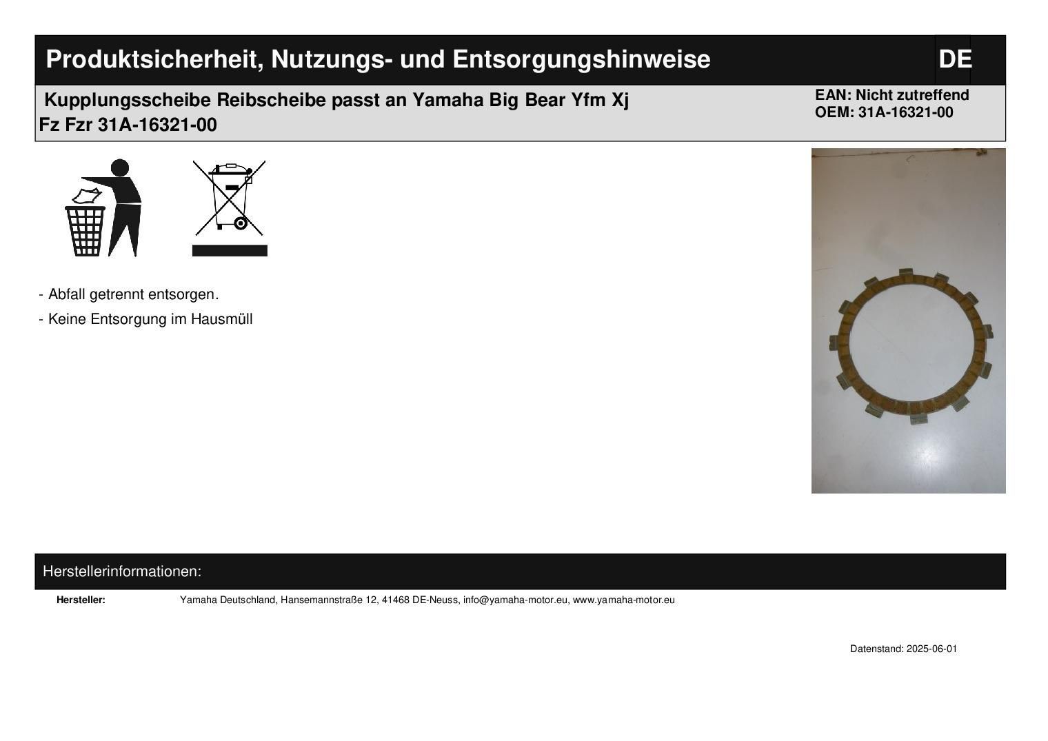 Kupplungsscheibe Reibscheibe passt an Yamaha Big Bear Yfm Xj Fz Fzr 31A-16321-00