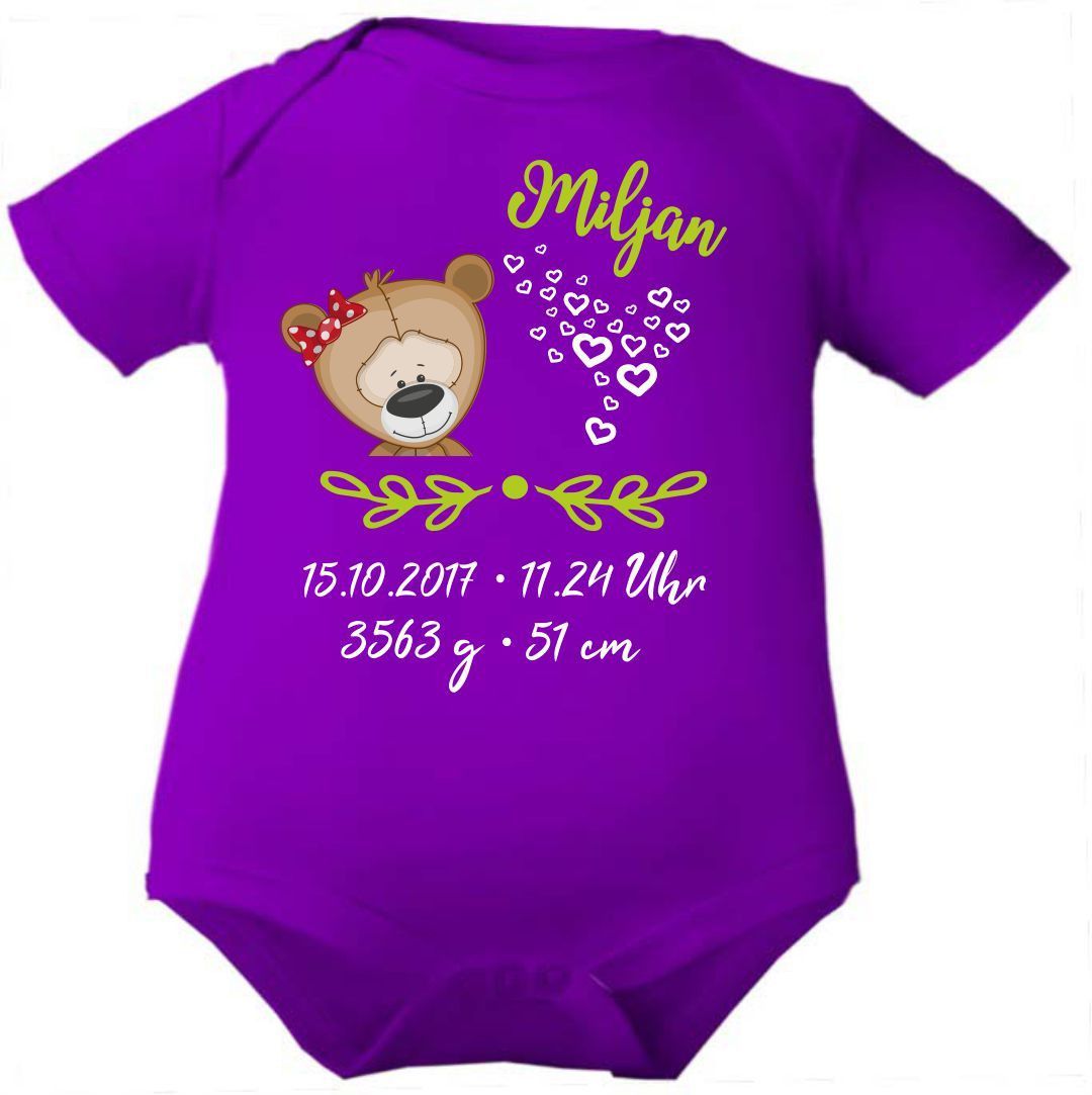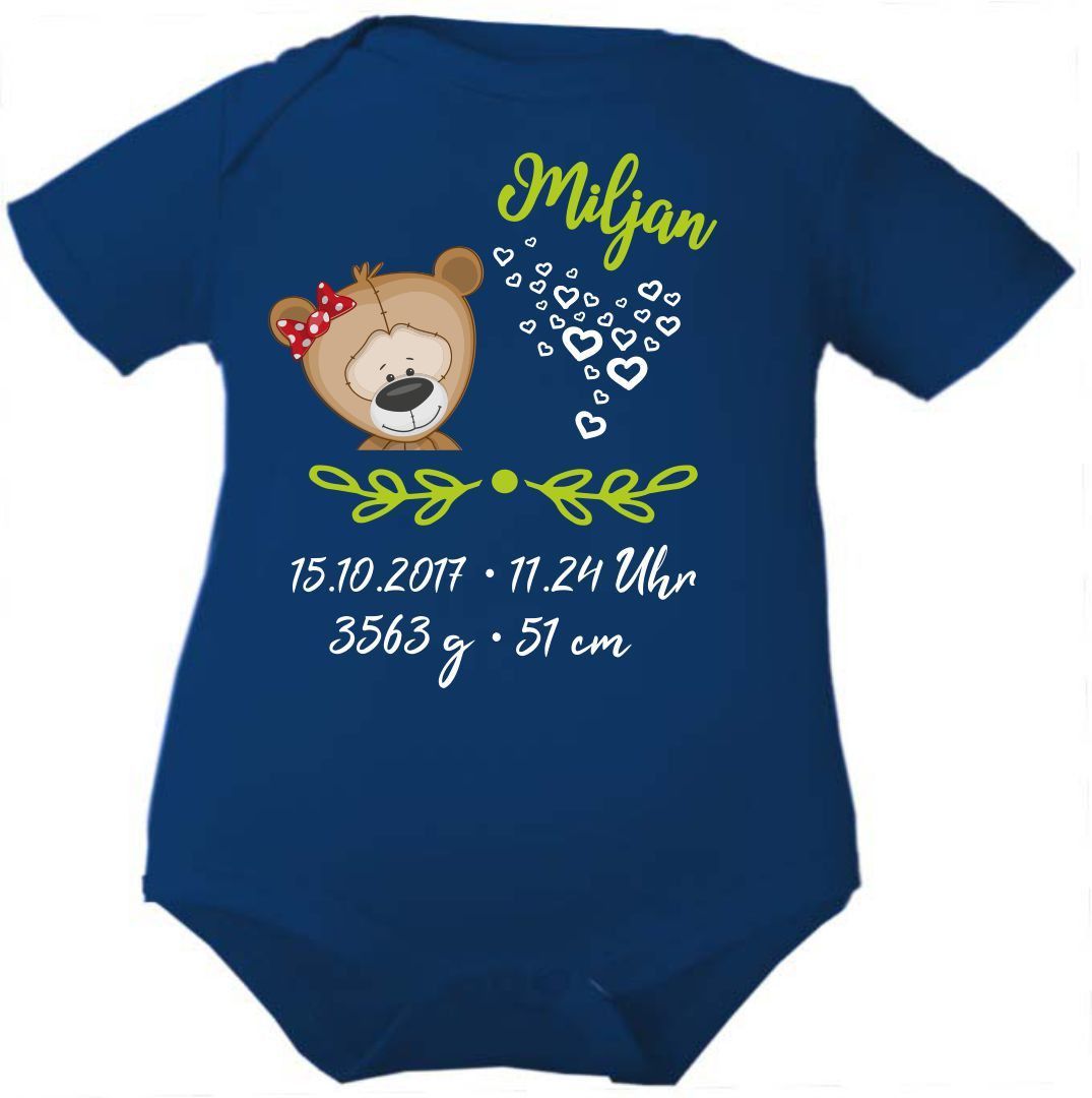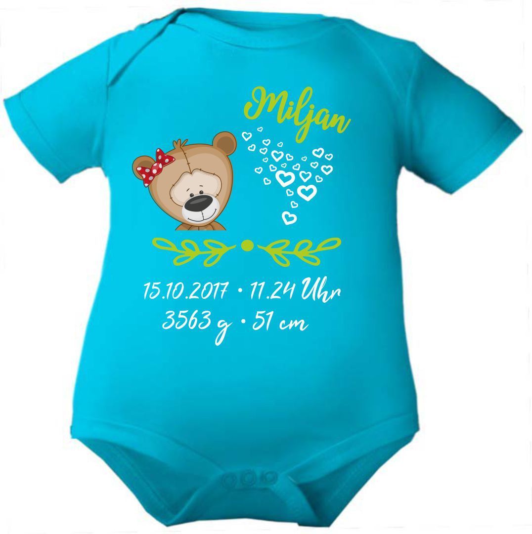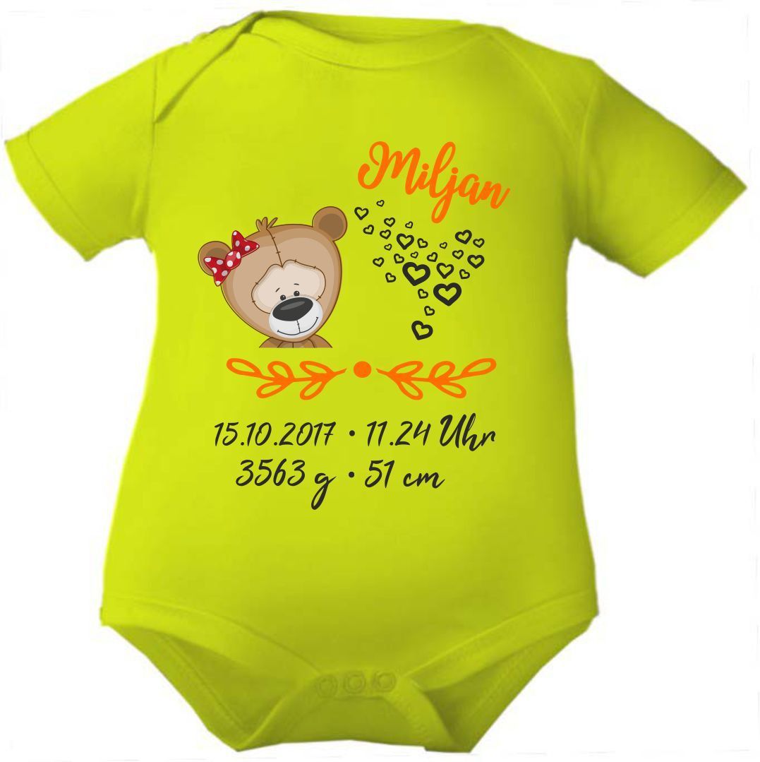 Kurzarm Baby Body personalisiert mit Motiv Bär mit Schleife und Geburtsdaten