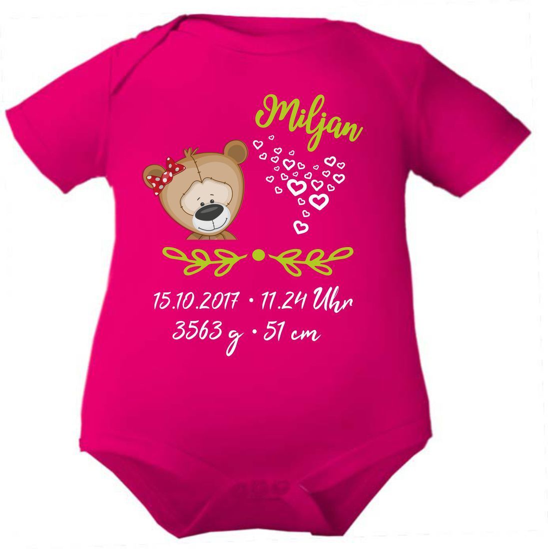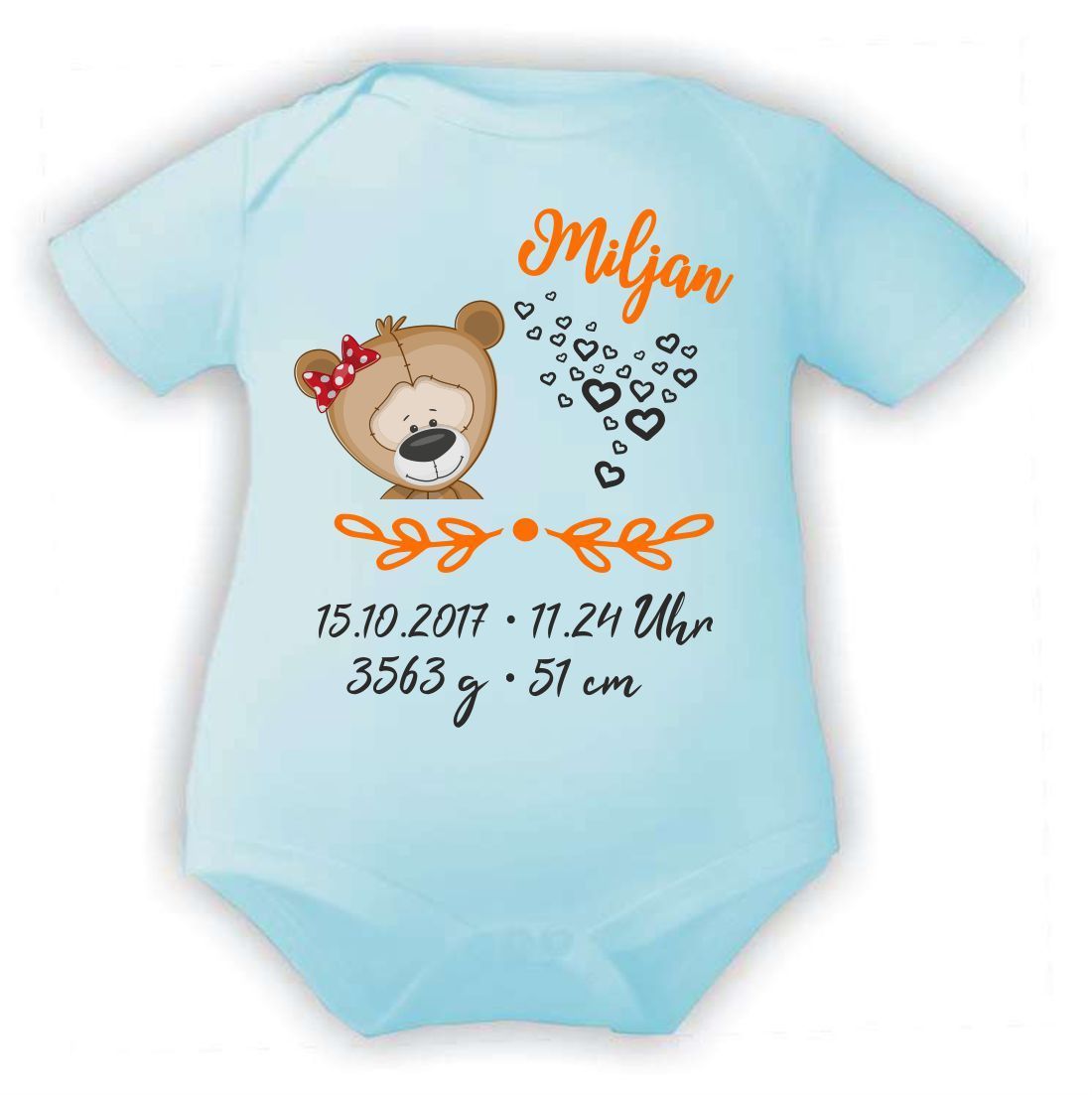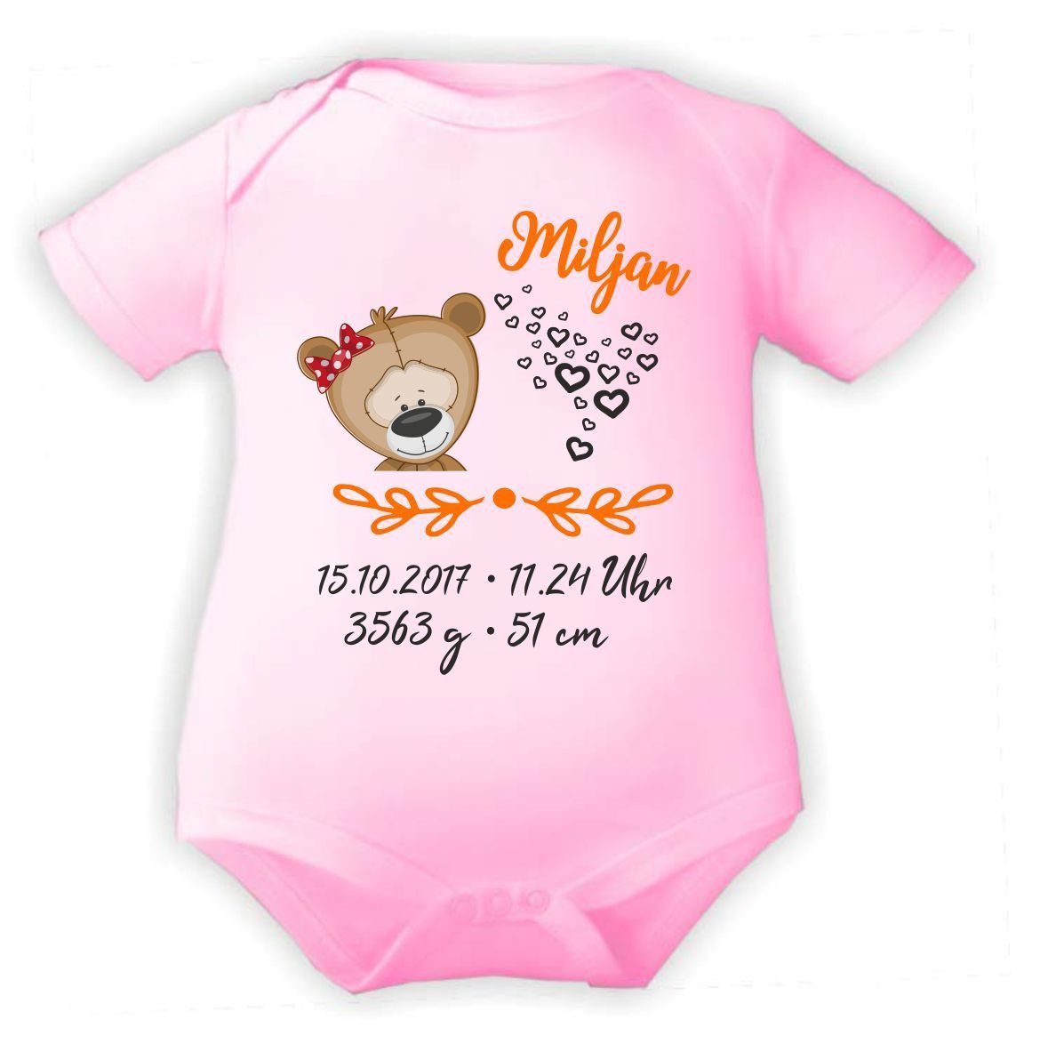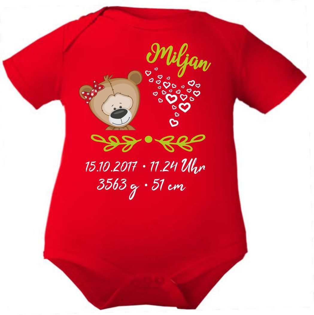 Kurzarm Baby Body personalisiert mit Motiv Bär mit Schleife und Geburtsdaten