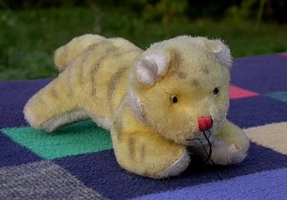 Kuscheltier Tigerbaby Der Körper ist relativ weich gepolstert. Dagegen ist der Kopf fester ausgestopft, vermutlich mit Holzwolle. Die Augen sind aus Glas. Die Nase ist aus rotem Faden gestickt und schwarzem Faden besäumt. Letzteres ist aber nicht mehr in Ordnung - es hängen einige schwarze Fäden her