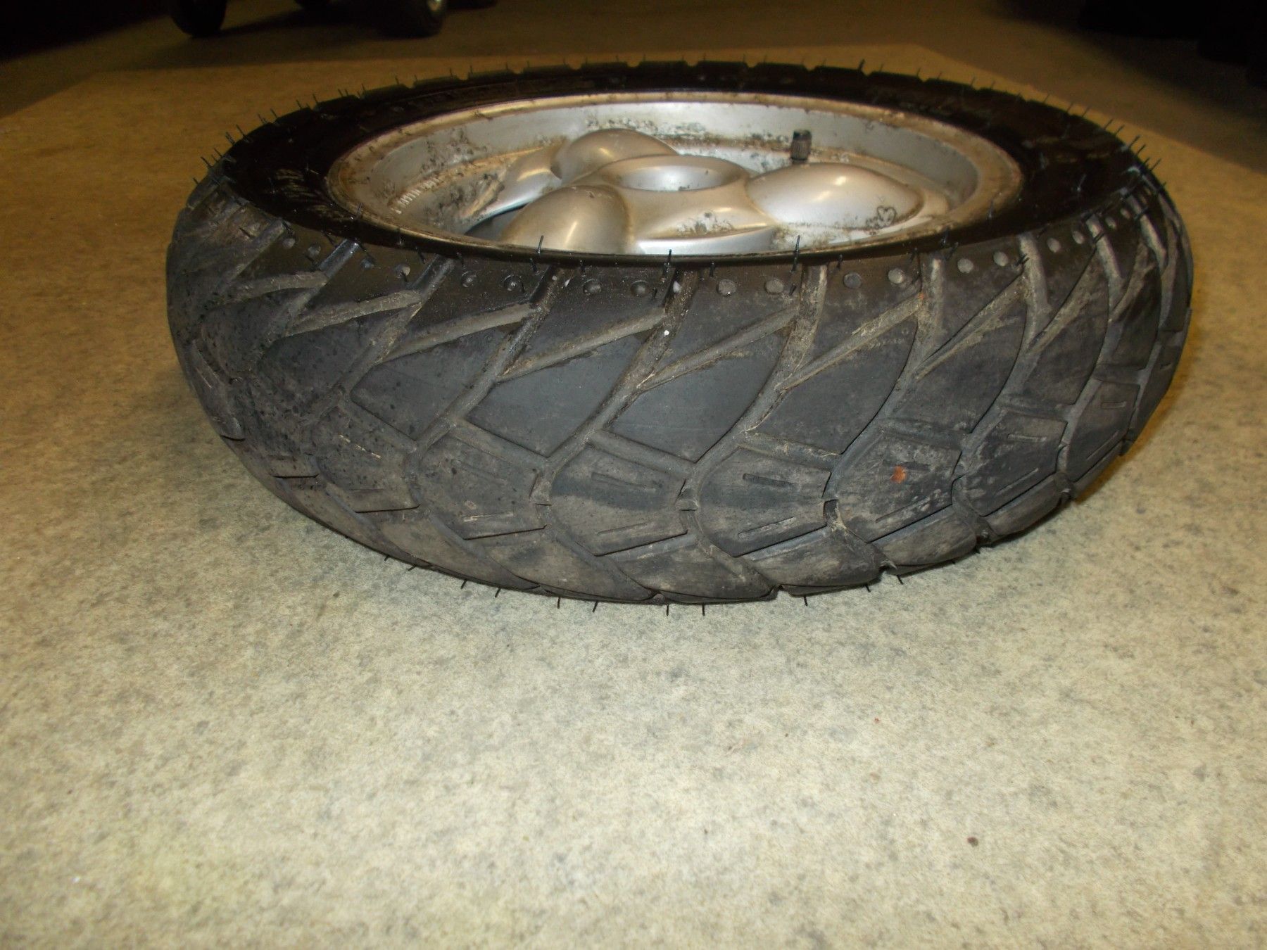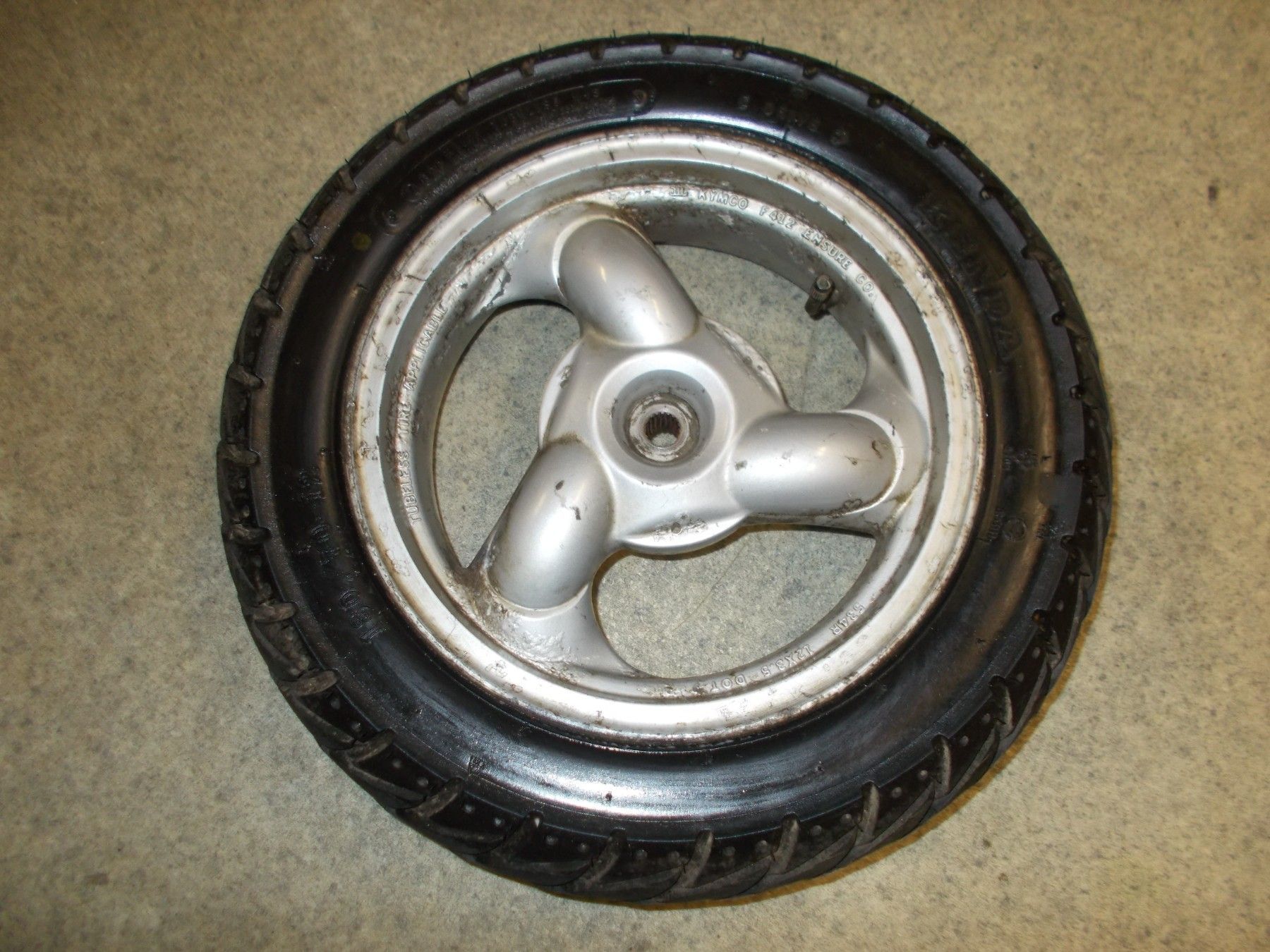 Ideal als Winterfelge da ein M+S Reifen verbaut ist. Größe 130/70-12 DOT 41/21 Profil noch gute 80%.