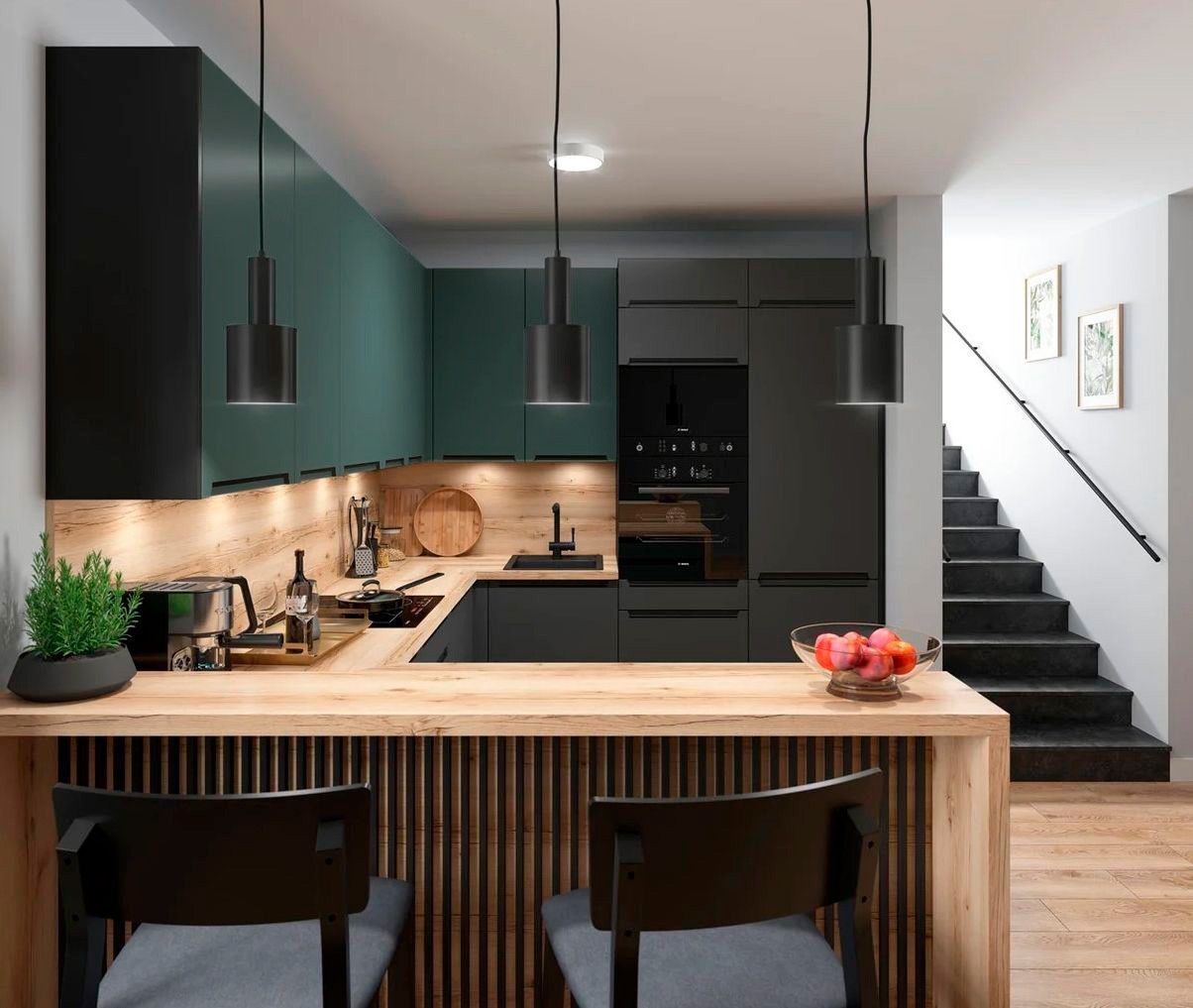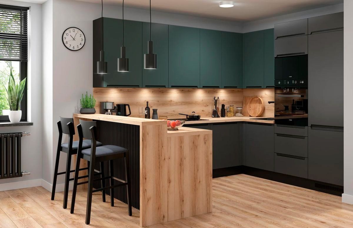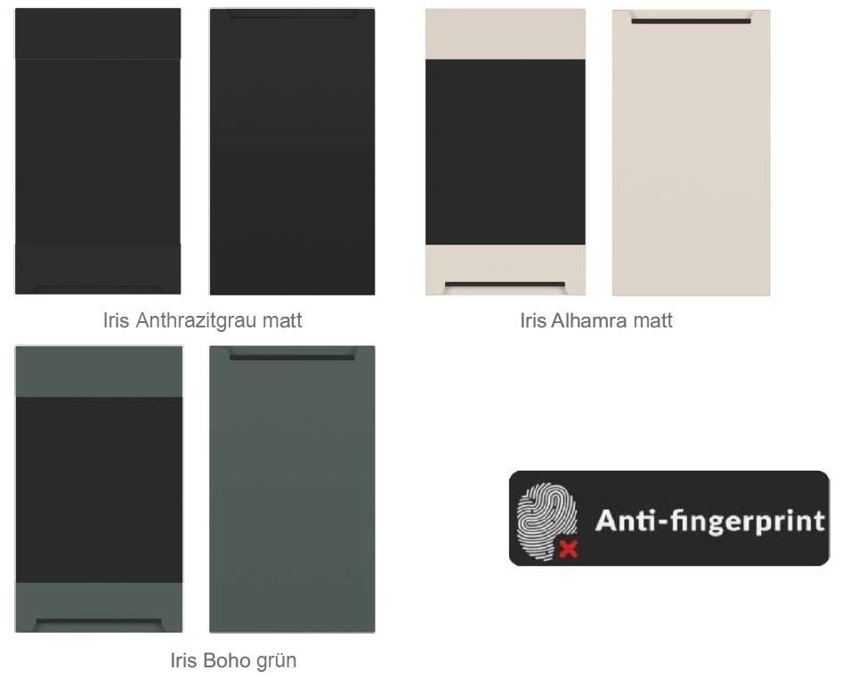 Beispiel L-Form Küche variabel stellbar NEU & Schnell Fronten: Boho grün oder Anthrazit matt - Musterfront sofort erhältlich Griffe - schwarze Griffleisten Korpus: schwarz Der Preis versteht sich ohne E-Geräte, Arbeitsplatten, Spüle und Dekoration. Griffe und Sockel sind im Preis enthalten. Lief