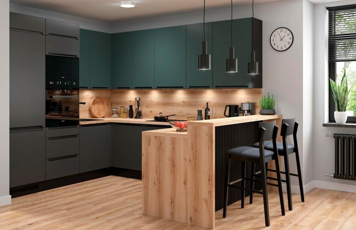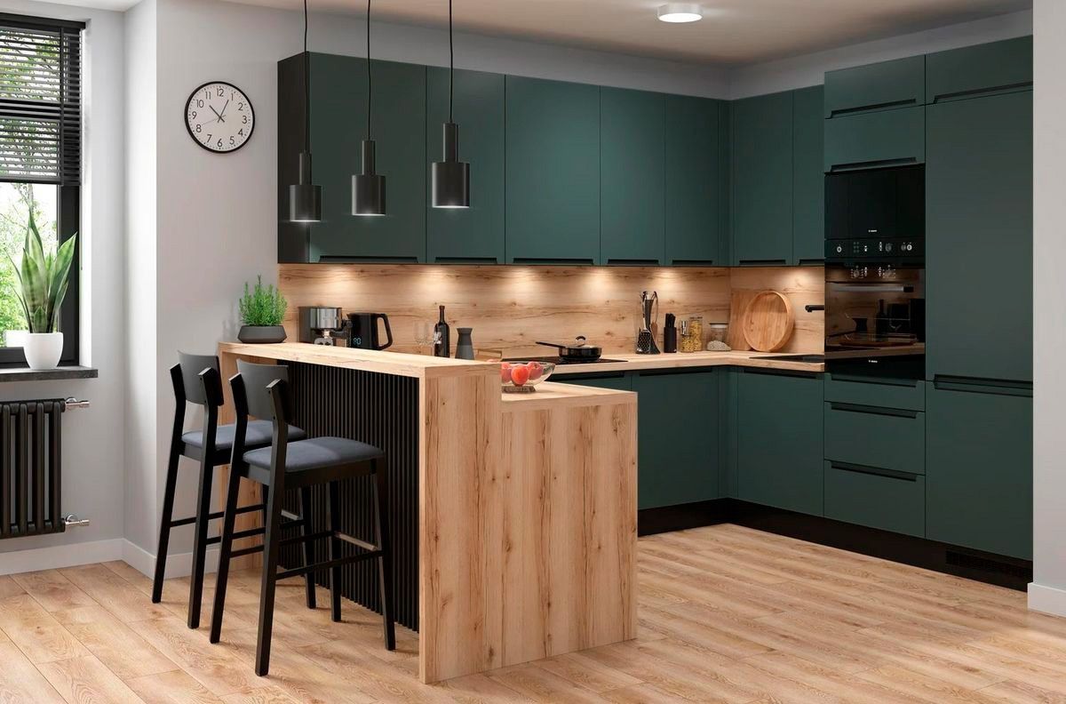 L Form Küche, Schränke, erweiterbar Boho grün oder Anthrazit matt Neu&Schnell