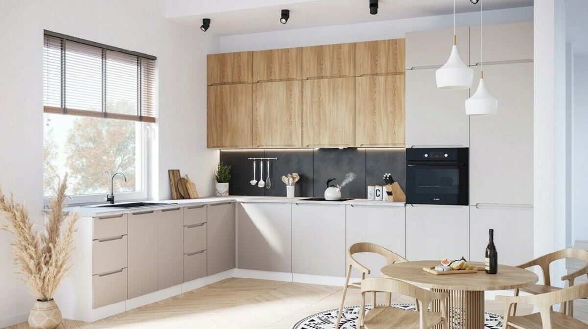 L Form Küche Schränke Hellgrau matt Eiche Halifax Griffmulden Softclose Schubladen