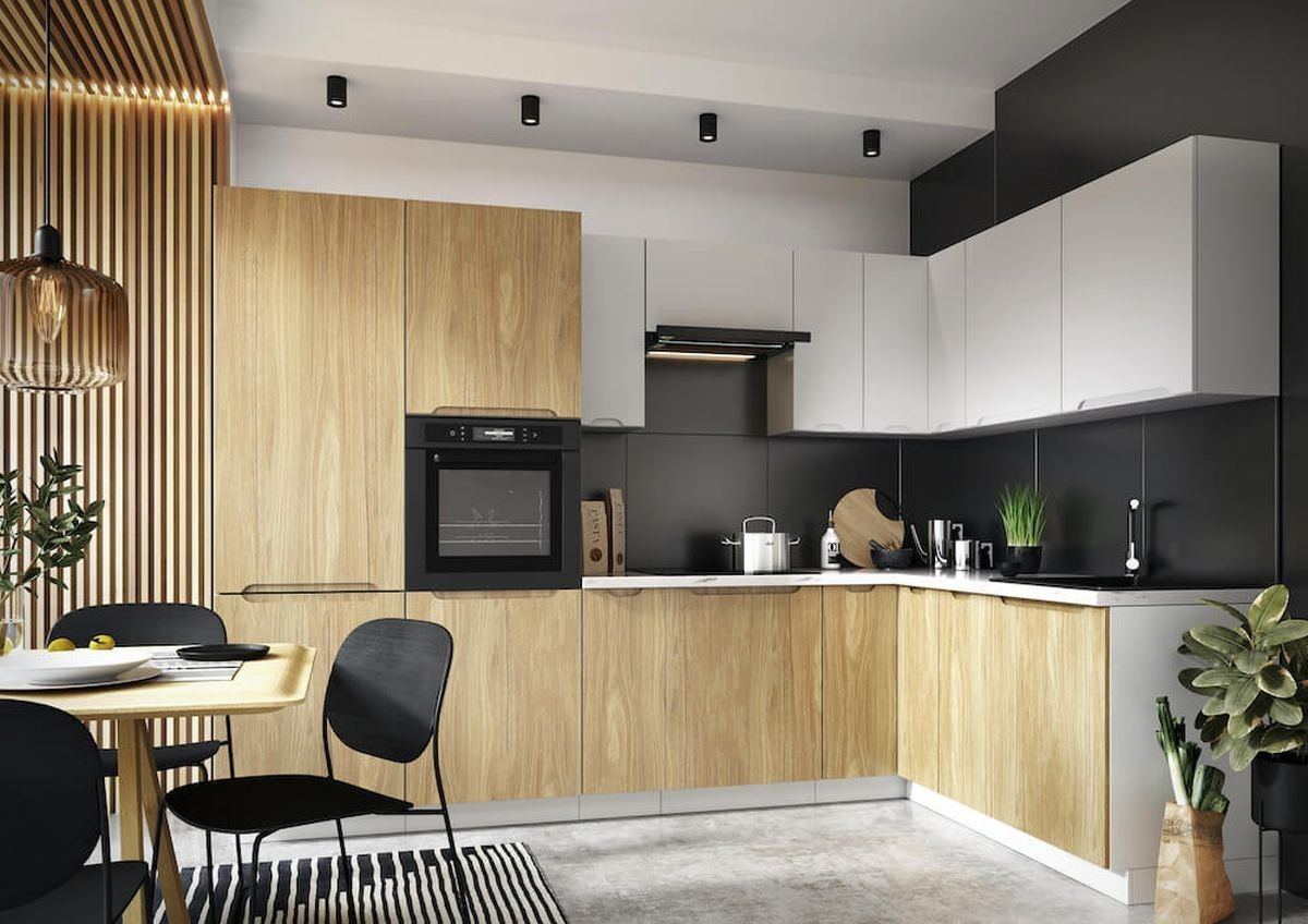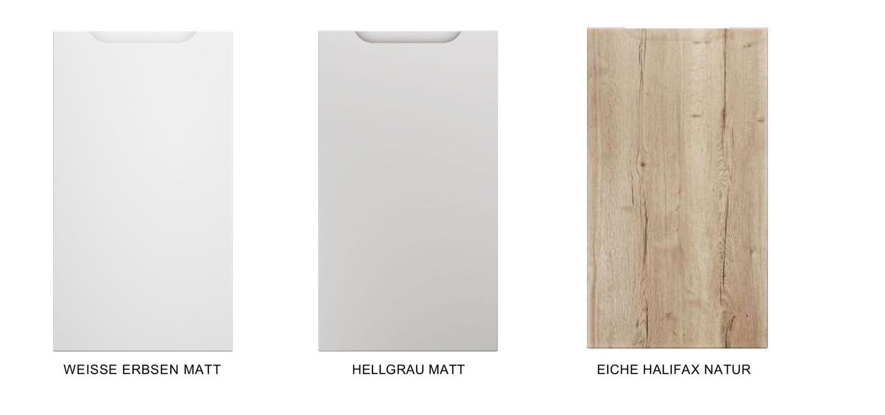 L Form Küche Schränke Naturholz hellgrau matt Griffmulden Softclose Schubladen