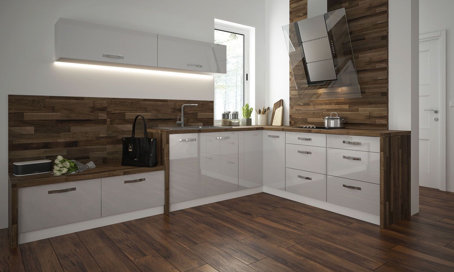 L-Form Küchenzeile "Essen" Einbauküche 290x210cm weiß Front weiß Acryl Hochglanz