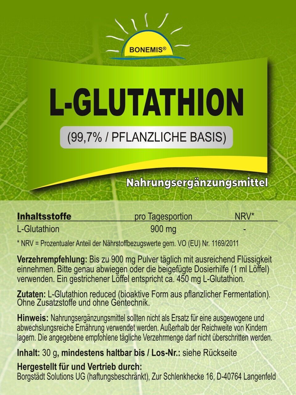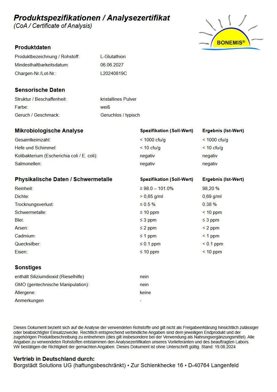 L-Glutathion (pflanzlich, reduced/bioaktiv), ohne Zusätze, 30 g Pulver, Bonemis®