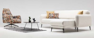 Weißes Wohnzimmer Set Designer Ecksofa Textilsessel Holz Couchtisch