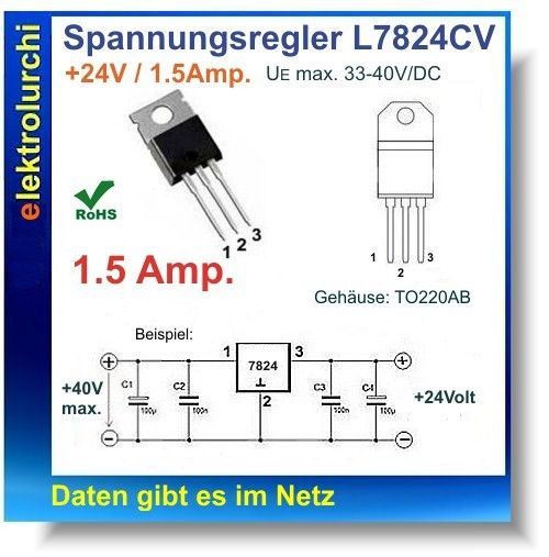 Sie bieten hier auf folgenden Artikel 2 Stück L7824CV - Spannungsregler + 24V, 1,5Amp., 7824, TO220, Spannung: +24V DC Strom: 1,5Amp. = 1500mA Gehäuse TO220 (Bild zeigt die Gehäuseform) Hersteller : STMicroelectronics Daten gibt es im Netz