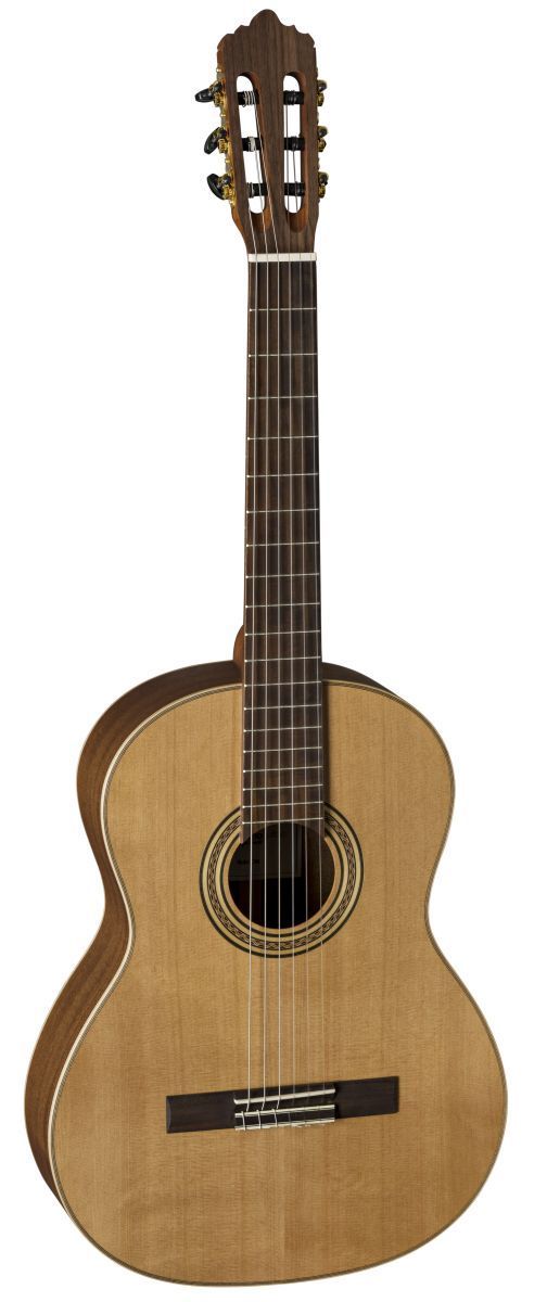 La Mancha Rubi CM 59-N Small Neck - Natur 3 4 Konzertgitarre Decke: Zeder, massiv Boden und Zargen: Mahagoni Hals: Toona Kalantas mit Carbon Verstärkung spanische Hals-Korpus Verbindung Griffbrett: Ovangkol Mensur: 59 cm Sattelbreite: 49 mm Mechaniken: gold platet mit schwarzen Flügeln Saiten: Savar