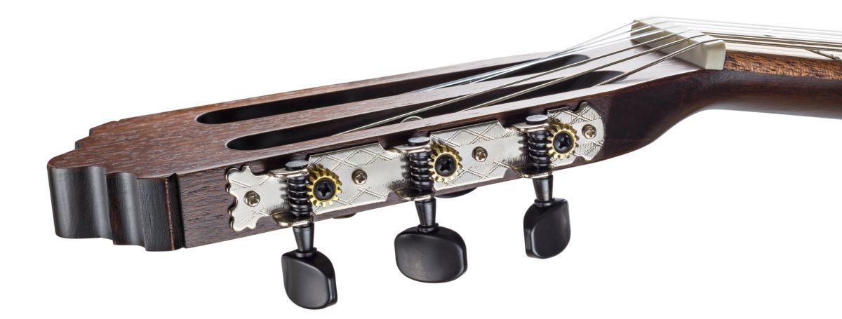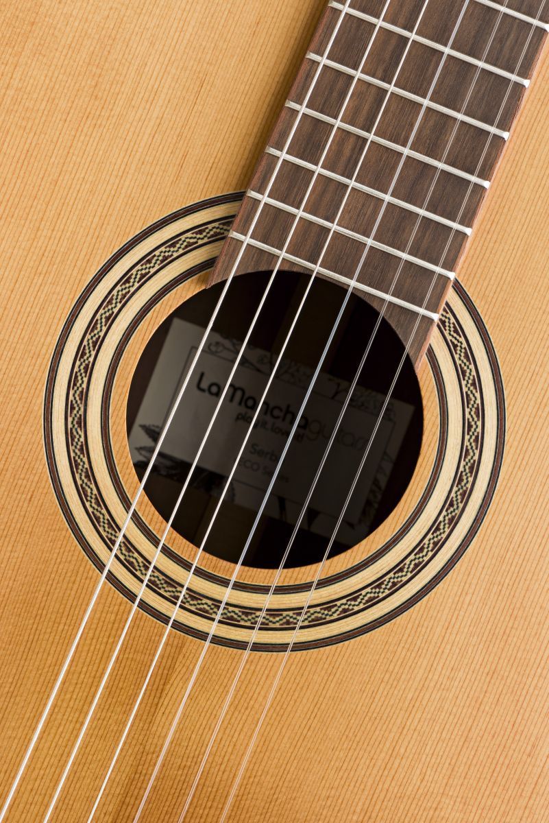 La Mancha Serba Konzertgitarre Decke: Deutsche Fichte, massiv Boden und Zargen: Elsbeere Hals: Kirsche mit Karbonverstärkung Hals-Korpus-Verbindung: spanisch Griffbrett: Eukalyptus Mensur: 65 cm ( 25,6' ) Sattelbreite: 52 mm Steg: Eukalyptus mit Doppelbohrung Sattel und Stegeinlage: Knochen Mechanik