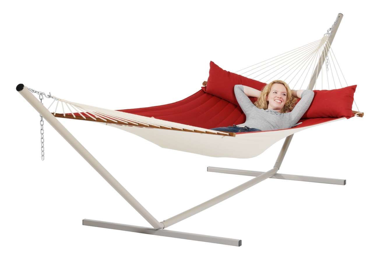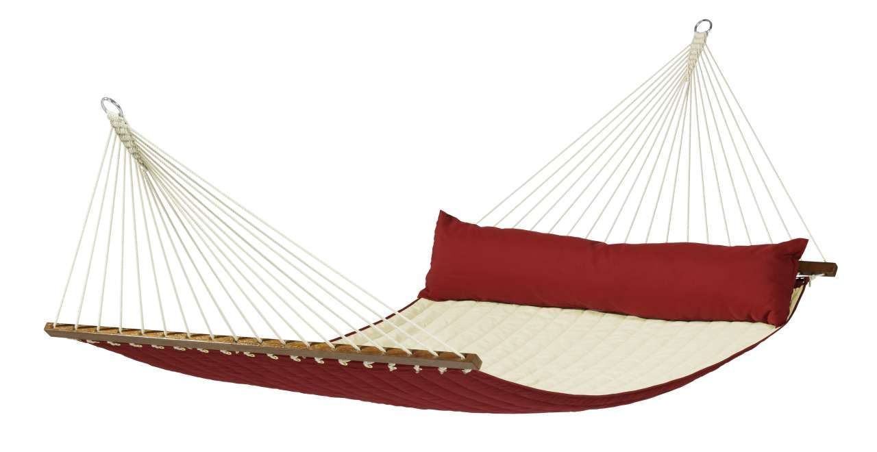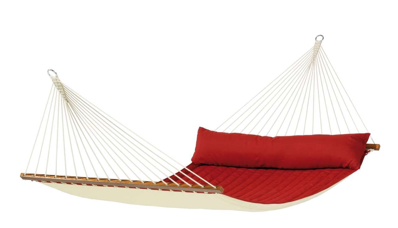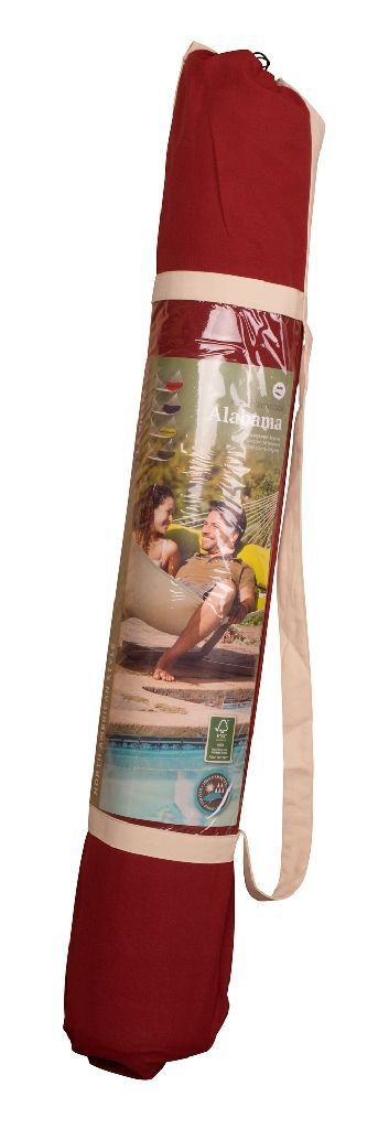 Die Alabama Red Pepper ist eine bequeme und wetterfeste Kingsize-Hängematte mit gepolsterter Liegefläche und abnehmbarem Kissen für großzügiges Entspannen im nordamerikanischen Stil. Farbe czerwony Geeignet für 2 Grösse Large Abmessungen Liegefläche 210 x 140 cm Gesamtlänge 400 cm Belastbarkeit maxi