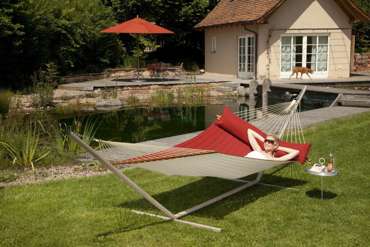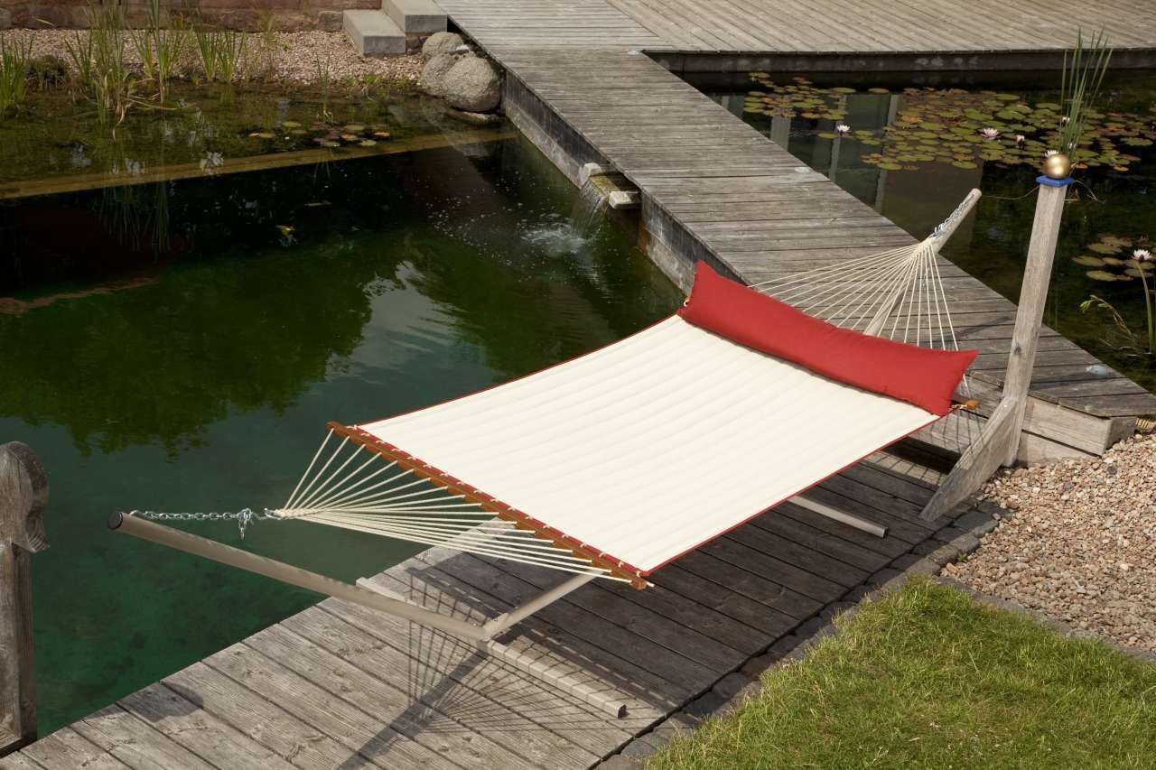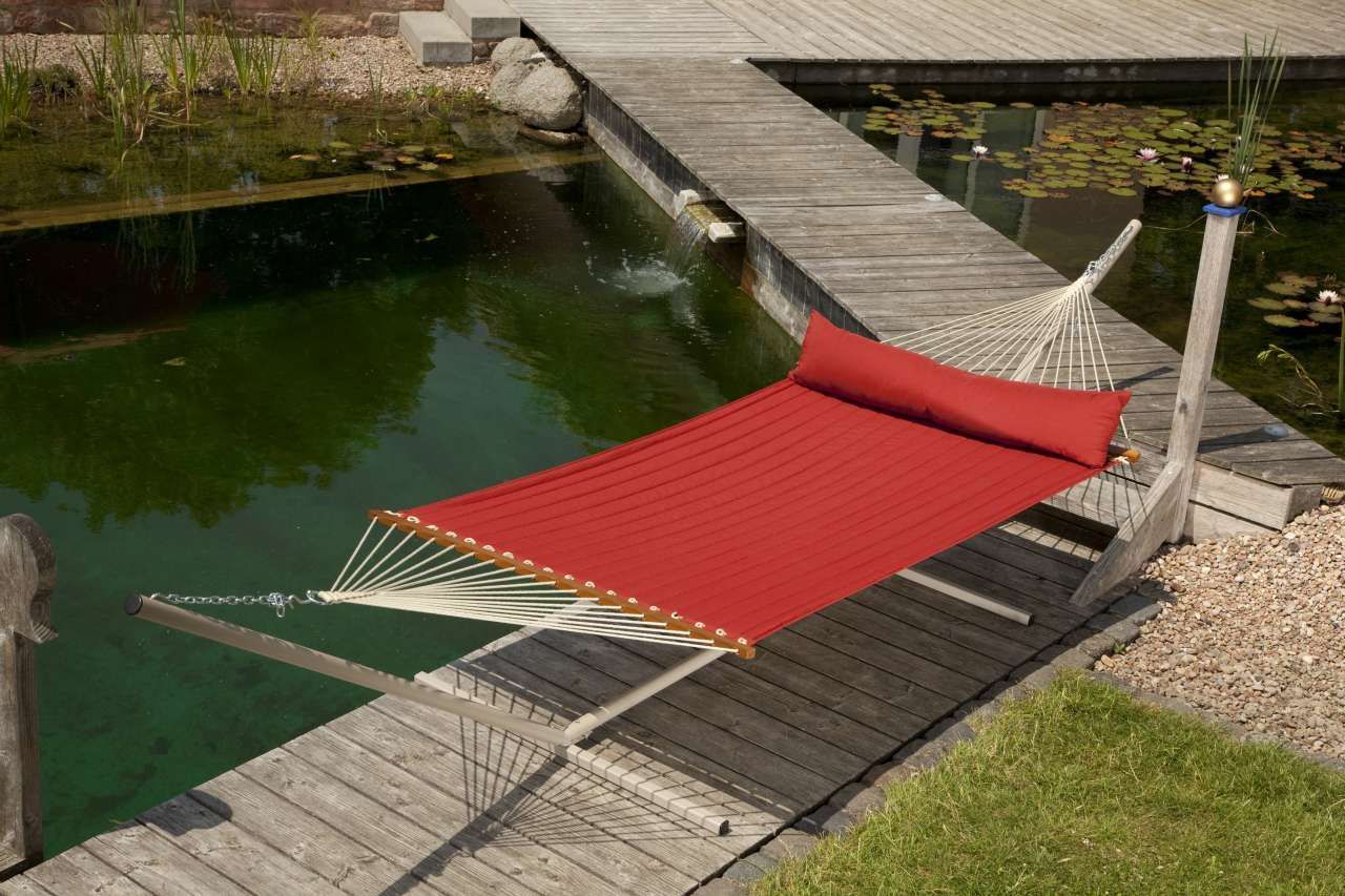 Die Alabama Red Pepper ist eine bequeme und wetterfeste Kingsize-Hängematte mit gepolsterter Liegefläche und abnehmbarem Kissen für großzügiges Entspannen im nordamerikanischen Stil. Farbe czerwony Geeignet für 2 Grösse Large Abmessungen Liegefläche 210 x 140 cm Gesamtlänge 400 cm Belastbarkeit maxi