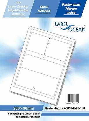LabelOcean LO-0003-e-70-100, 300 Etiketten, 200x90 mm, 100 Blatt DIN A4, 70g/ qm