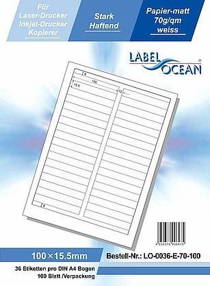 LabelOcean LO-0036-E-70-100, 3600 Etiketten, 100x15,5 mm, 100 Blatt DIN A4, 70g/ qm