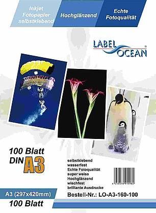 LabelOcean Premium Fotopapier selbstklebend 100 Blatt A3 Highglossy hochglänzend wass