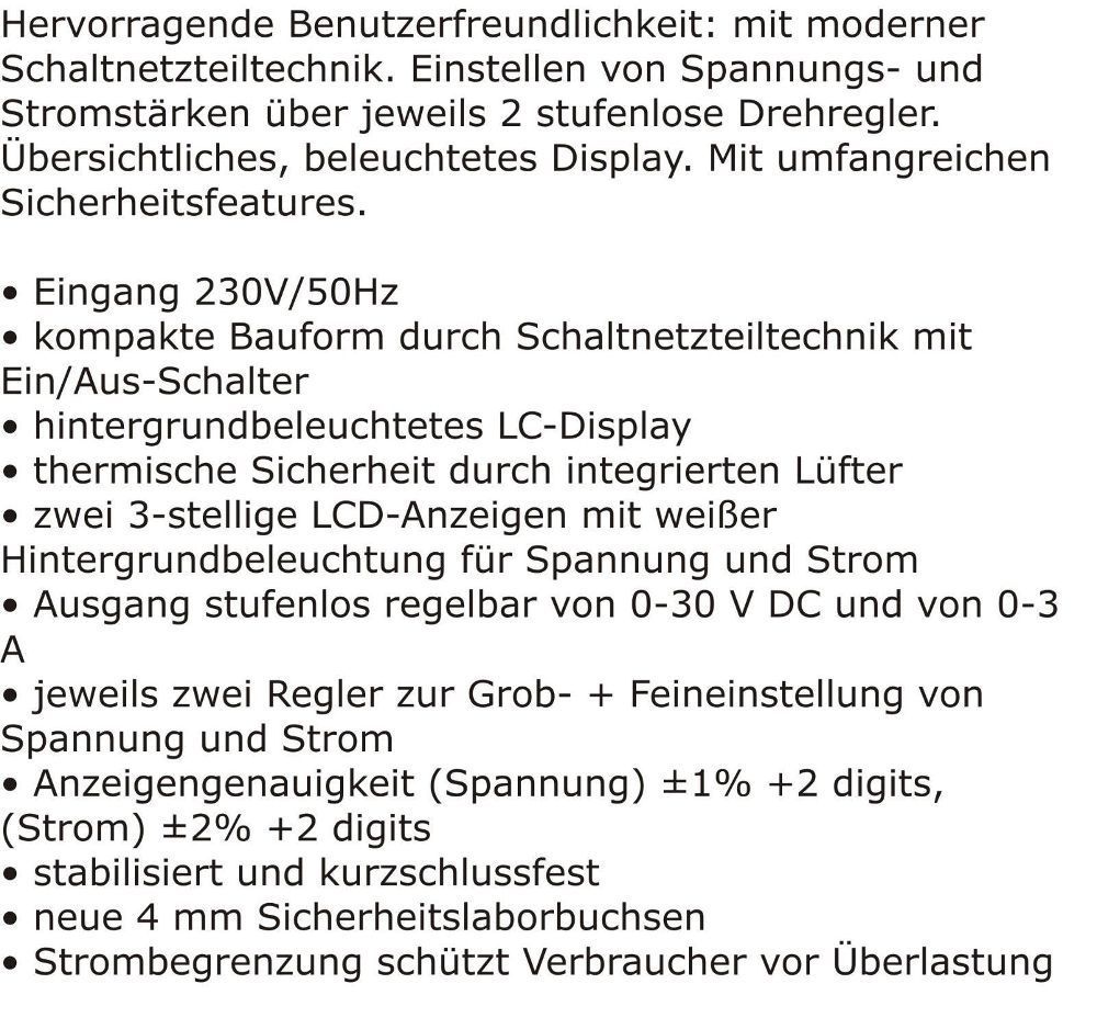 McPower Labornetzgerät LBN 303 0-30 V, 0-3 A regelbar, LCD-Anzeige Spannungsversorgung
