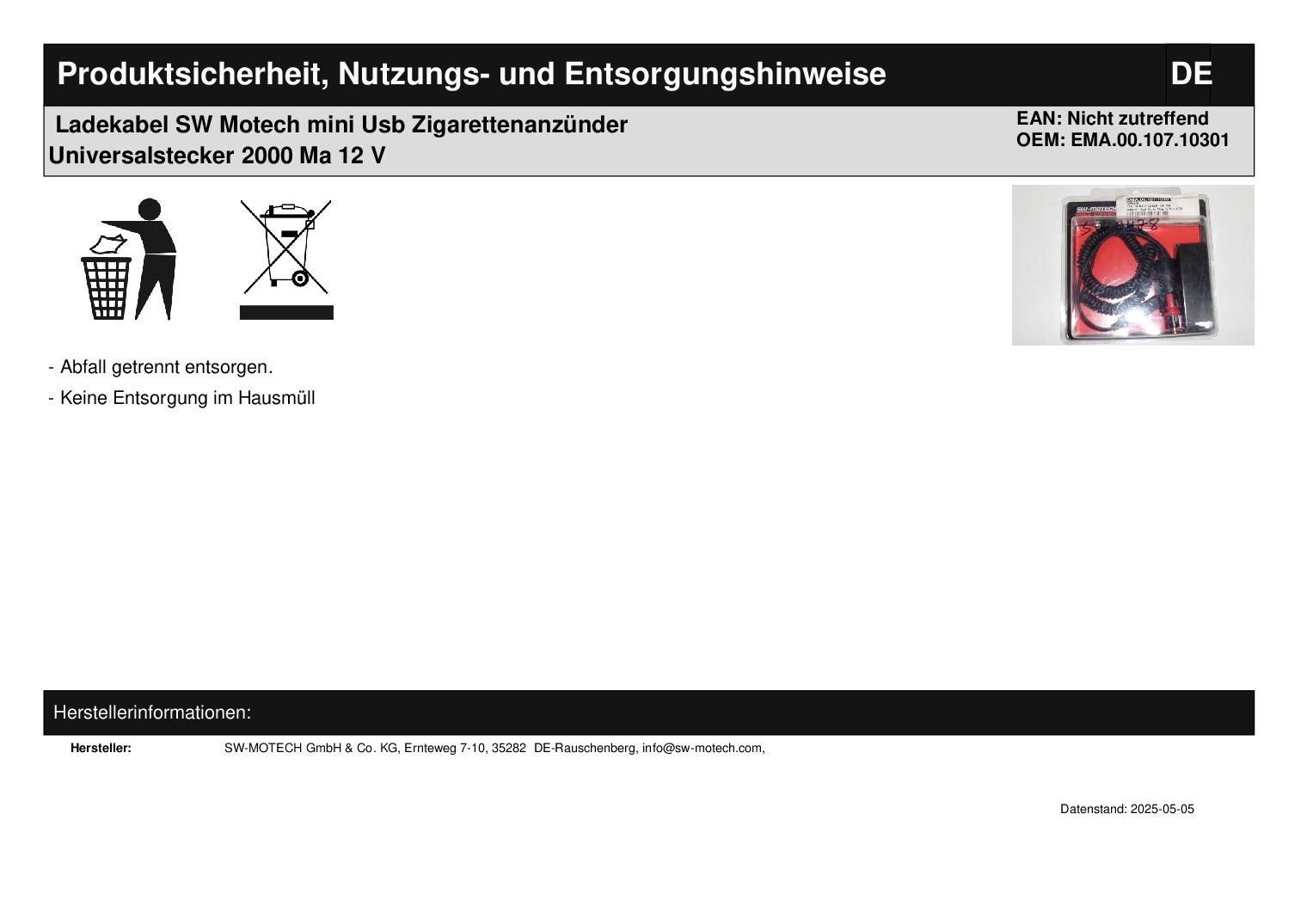 Ladekabel SW Motech mini Usb Zigarettenanzünder Universalstecker 2000 Ma 12 V