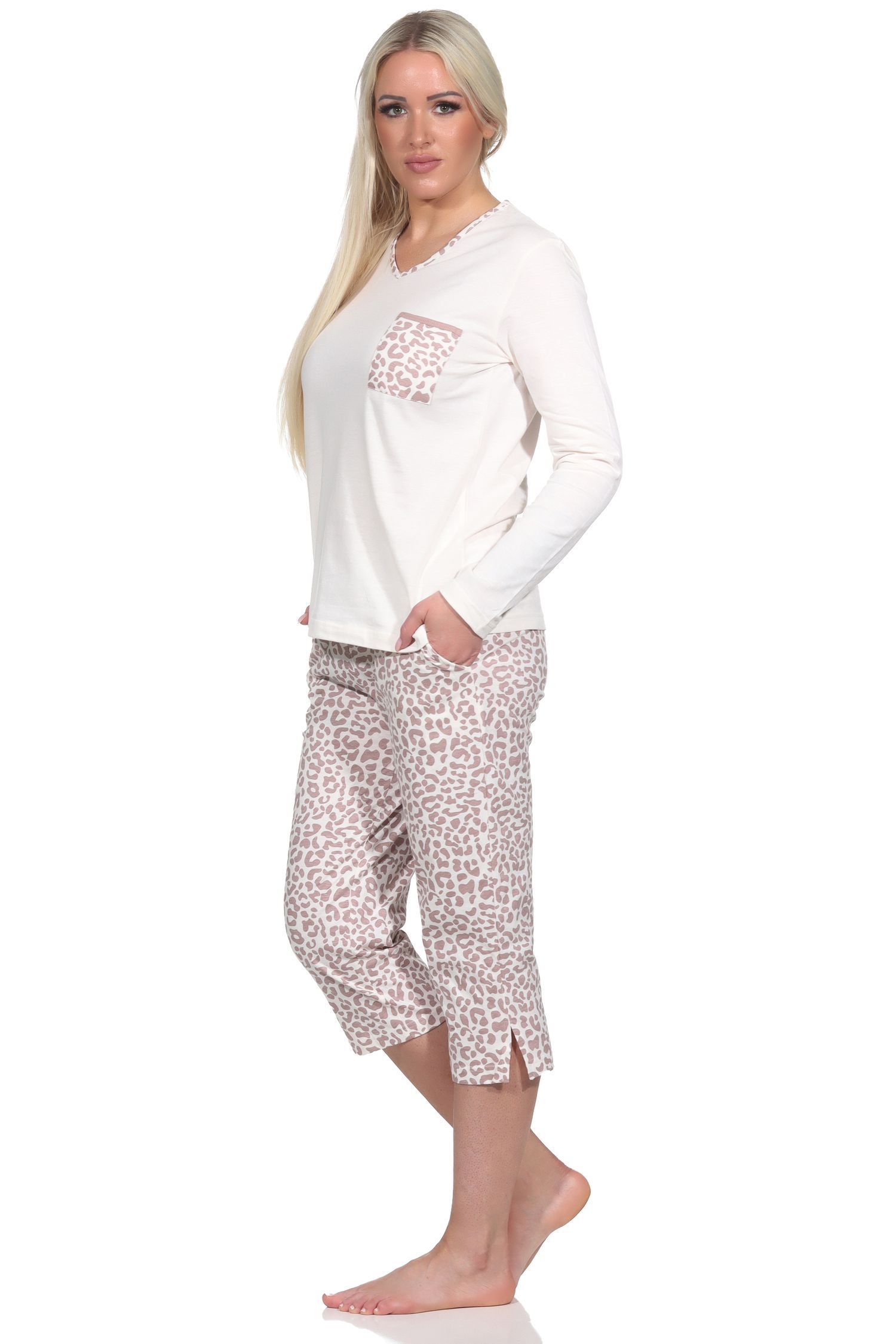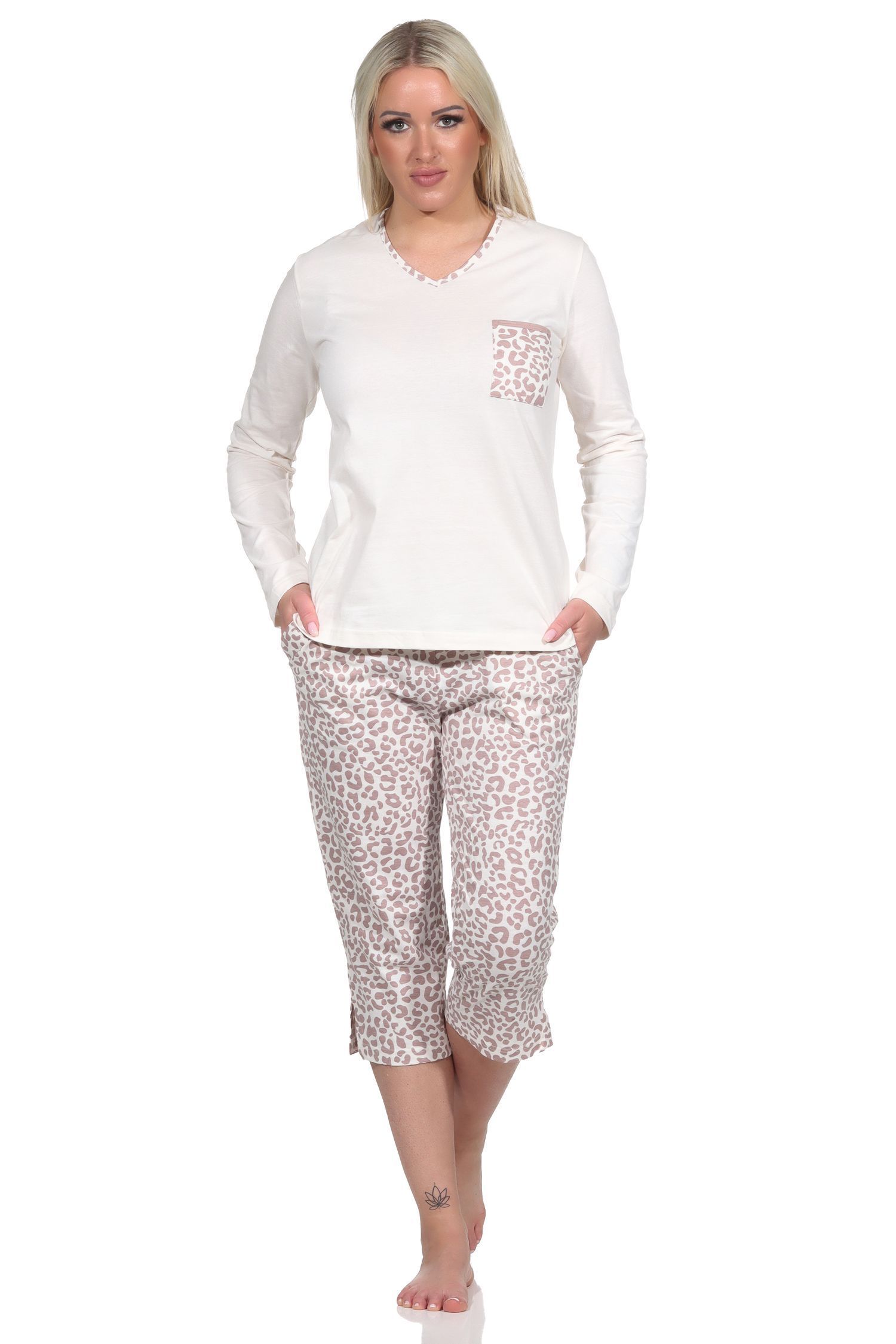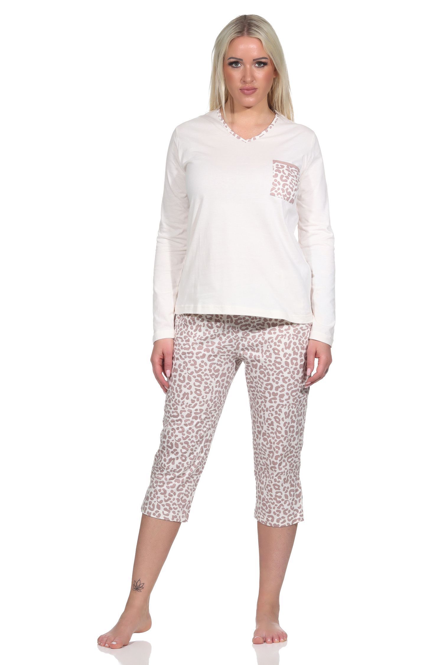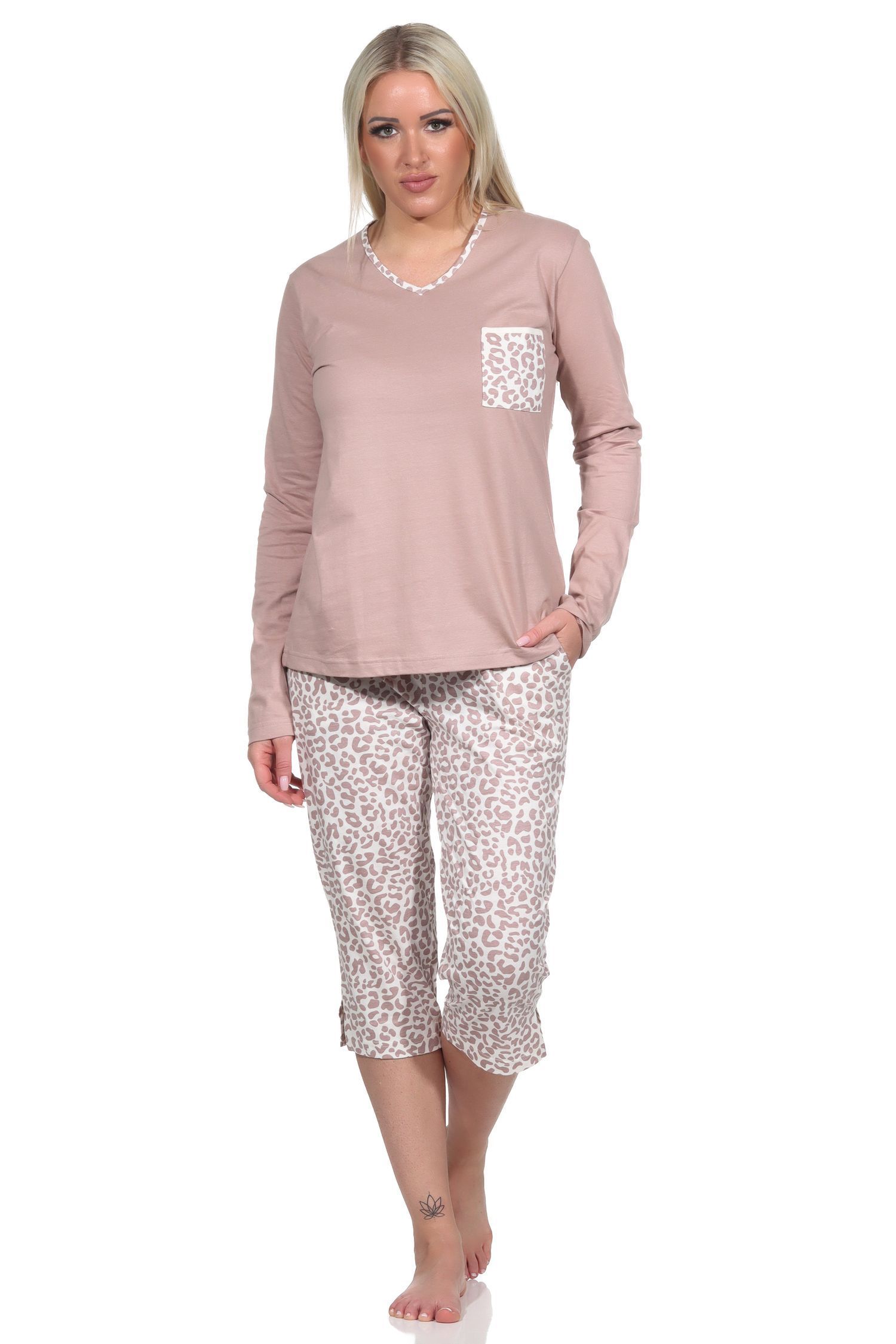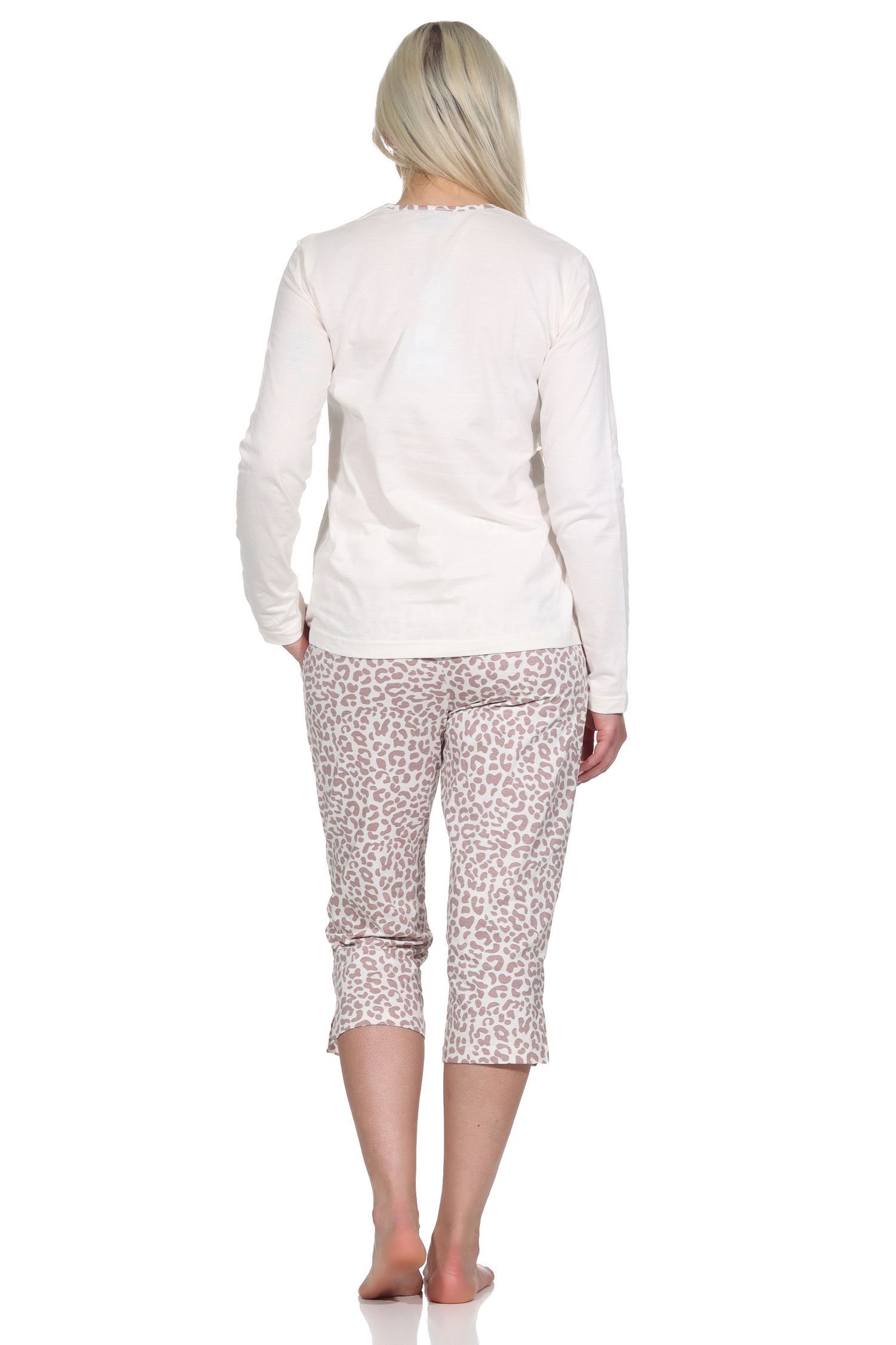 Lässiger Damen Pyjama kurzarm Schlafanzug mit Caprihose in Leo-Print Optik