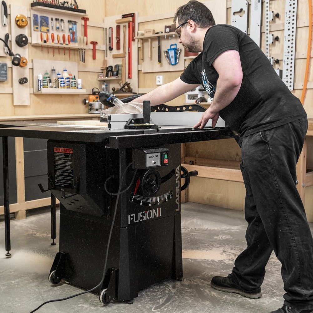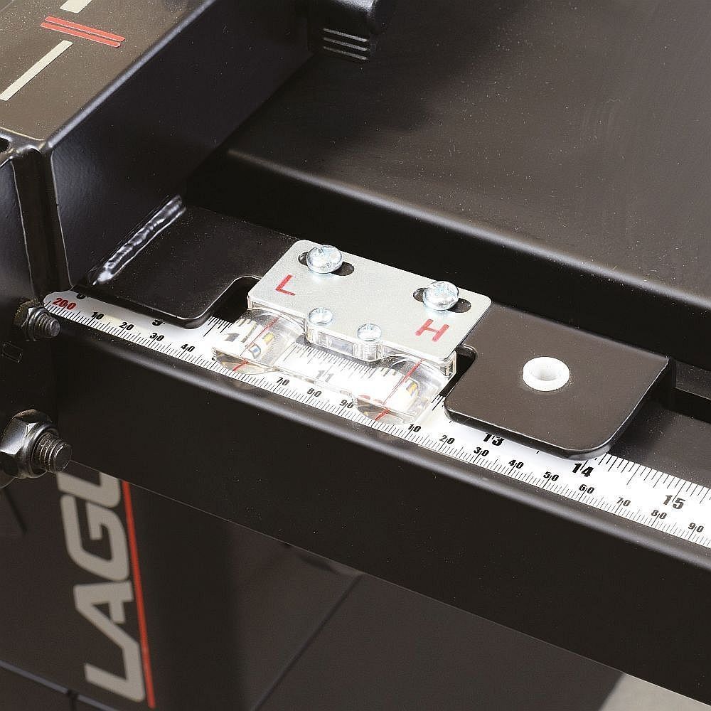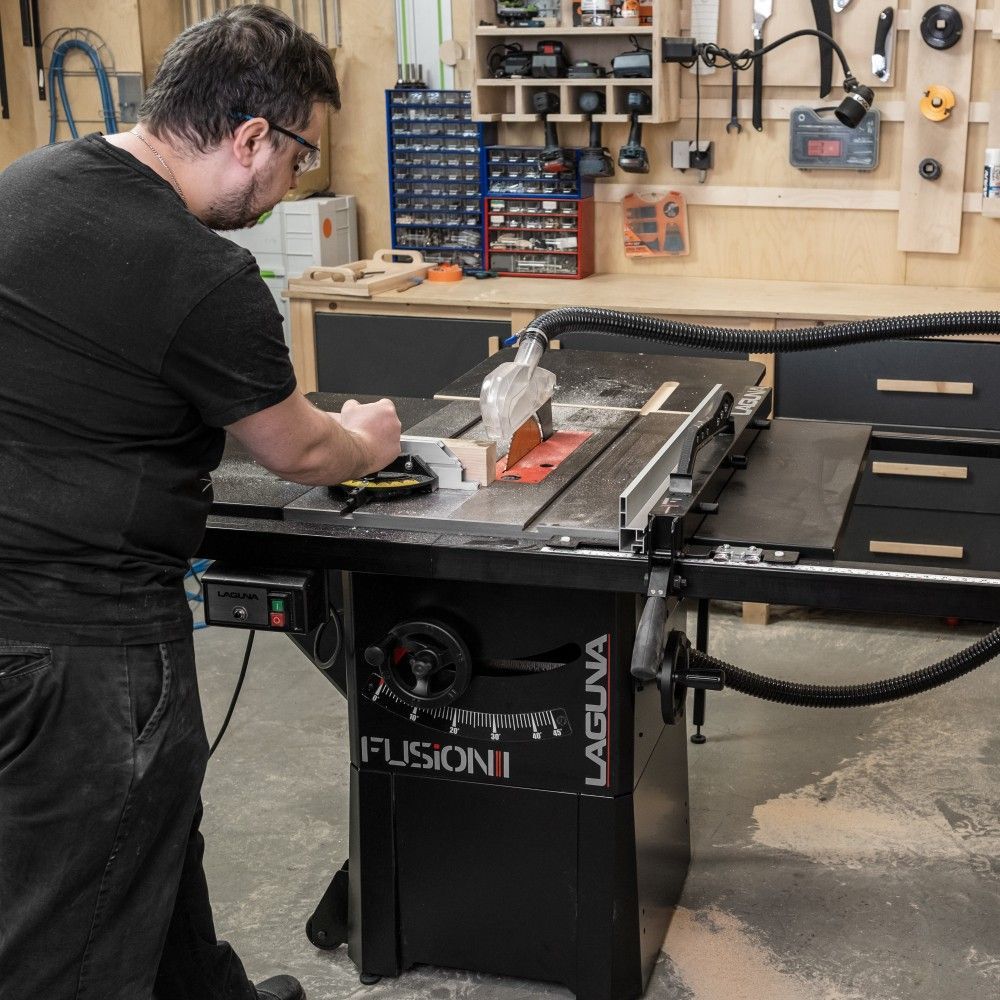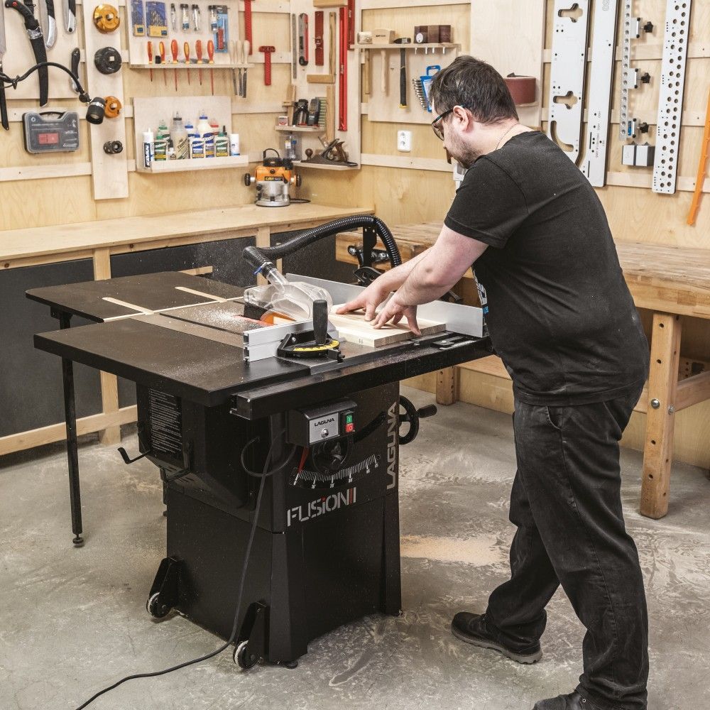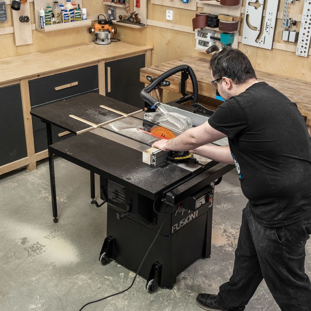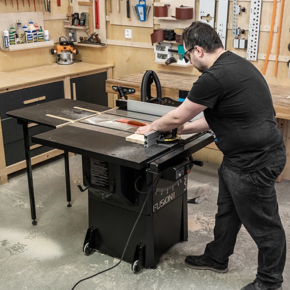 • Längslineal • Winkellineal • Materialzuführung • Obere Absaughaube • Hintere Tischverlängerung • Sägekreisblatt aus Hartmetall für universelle Anwendung (Durchschnitt 250/30 mm, Z40) • Schlauch für Absaugung