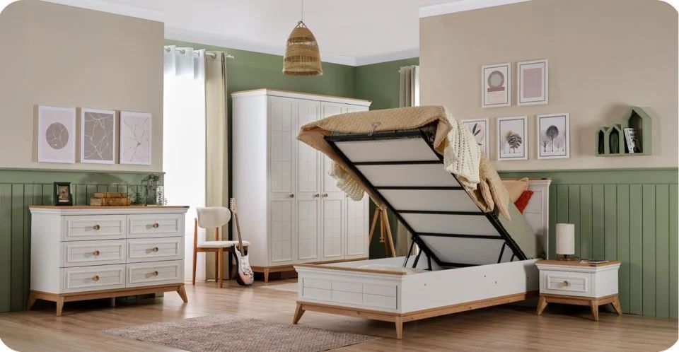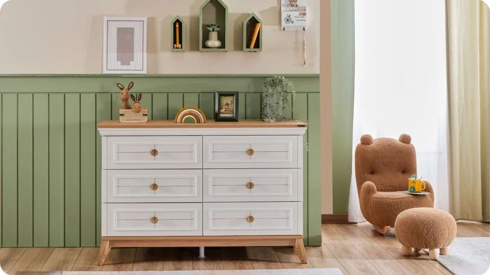 Melaminbeschichtete Spanplatte und PVC-beschichtetes MDF-Profil für allgemeine Verwendung Schubladenschienen mit versteckter Bremsschiene Schubladenfronten mit Lasergravurmuster und MDF-Oberflächenprofil Dekoratives MDF-U-Profil auf der Kommode Holzartiger Designgriff, passend zum Set ABS-Kunststoff