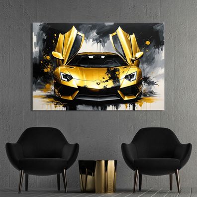 Lamborghini Goldenes Luxus auto , Wandbild Leinwand-Bild mit Rahmen XXL Deko Kunst