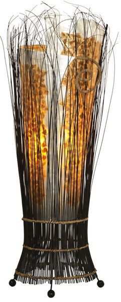 Lampe Yuni , ca. 70 cm oder 100 cm hoch Diese Deko-Leuchten sind konisch und haben von oben her betrachtet die Form einer Schnecke. Diese von Hand gefertigte Lampen sind mit Bambusringen gestaltet und wurden mit Rispen der Bananablätter umkranzt. Alle Vendo-Leuchten und Lampen sind mit genormten E14
