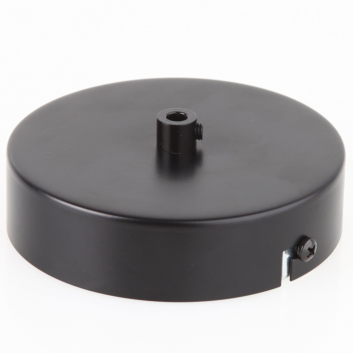 Eleganter Zier-Baldachin aus schwarz lackiertem Metall mit integriertem Klemmnippel-Zugentlaster und seitlicher Madenschraube. Ideal für die sichere, dezente und stilvolle Deckenmontage von Pendelleuchten.